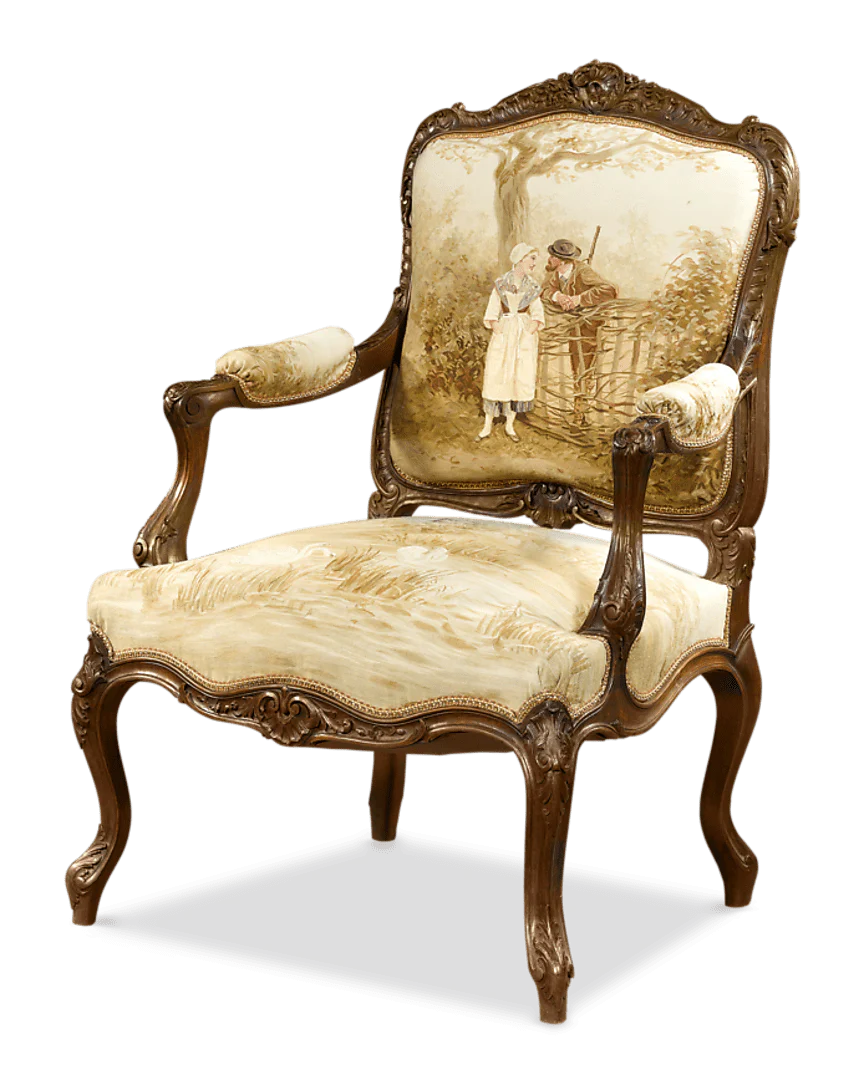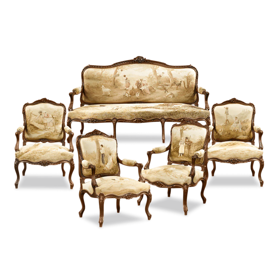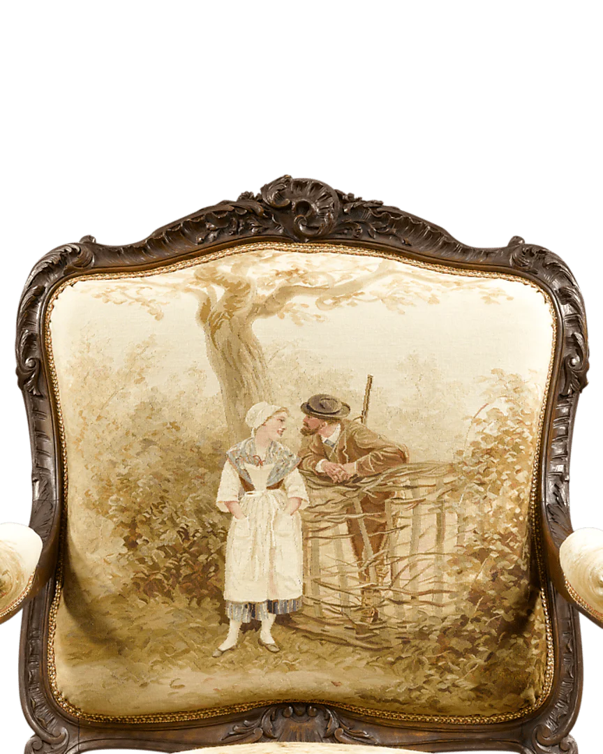 The Aubusson region was the leading manufacturer of fine tapestries since their emergence in the 14th century, with an impressive repertoire that made them the first choice among 18th-century French nobility. Because they favored a certain degree of harmony in their décor, a room whose walls were hung with classically-inspired tapestries would naturally be paired with furnishings bearing similar woven motifs. The late 19th century witnessed a great revival of these early Aubusson furnishings amongst the elite. This suite is a particularly fine example of the Louis XV style, exhibiting the highest quality craftsmanship in all respects.