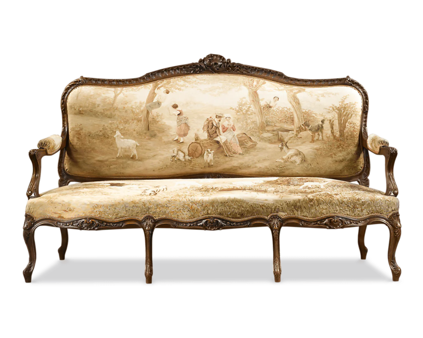 This gracious Louis XV-style parlor set is richly upholstered in the most exceptional hand-woven Aubusson tapestries. The best examples are considered to be those with figural motifs, and this particular suite is distinguished by pastoral scenes of both people and animals, the most rare and desirable of all. Aubusson tapestries have been recognized for their superb quality for centuries, and are increasingly difficult to find in such pristine condition. A fine walnut suite such as this, comprised of a sofa and four armchairs, was extremely labor intensive to create, therefore available only to the wealthiest households. Today, it is extremely rare to find a large suite retaining such high levels of quality, condition and elegance. Combining the talents of both the ébéniste and tapestry weaver with exceptional style and sophistication, this set is a superior find.