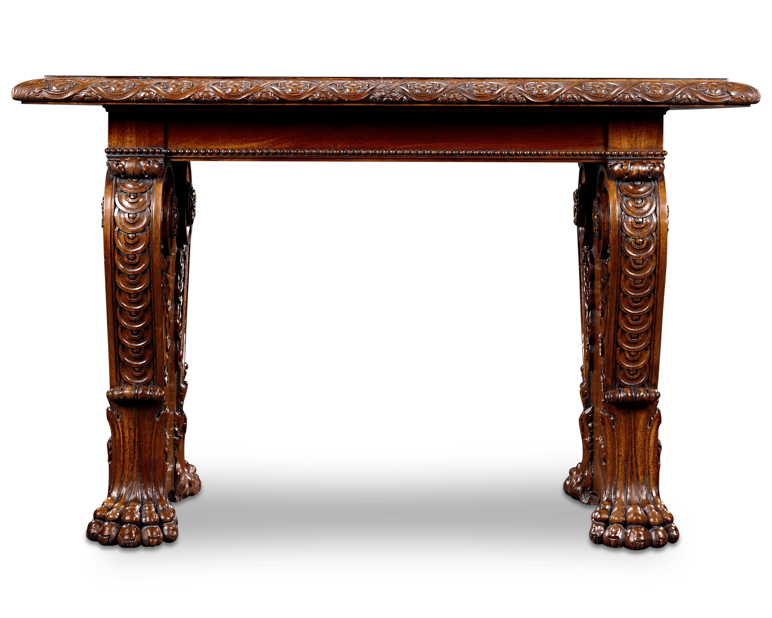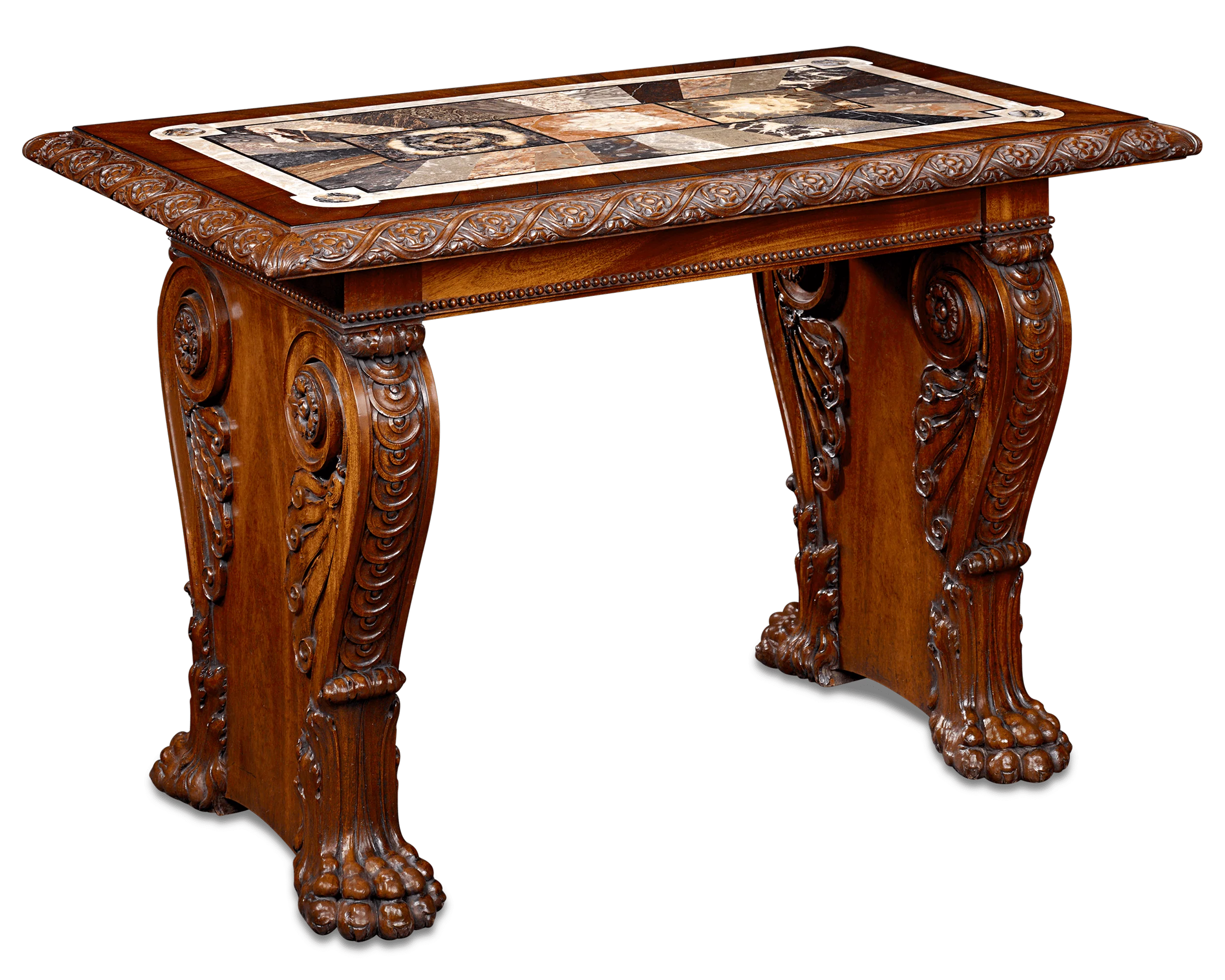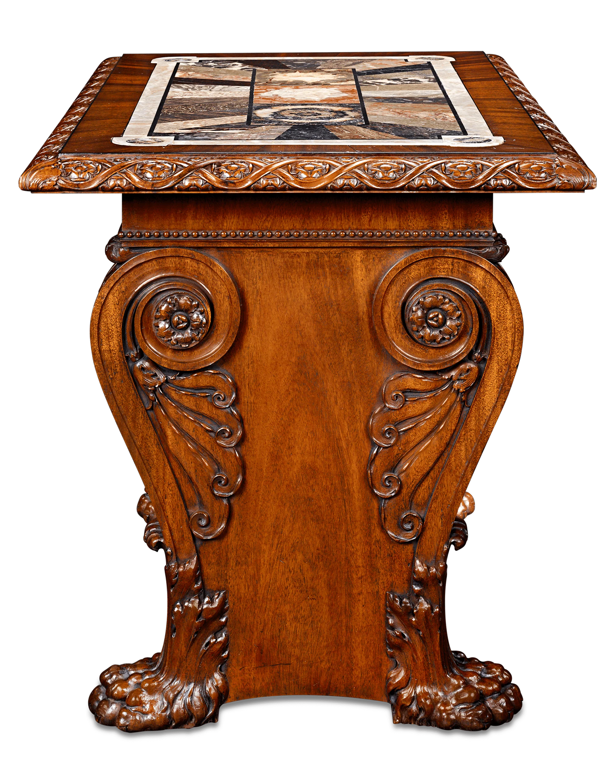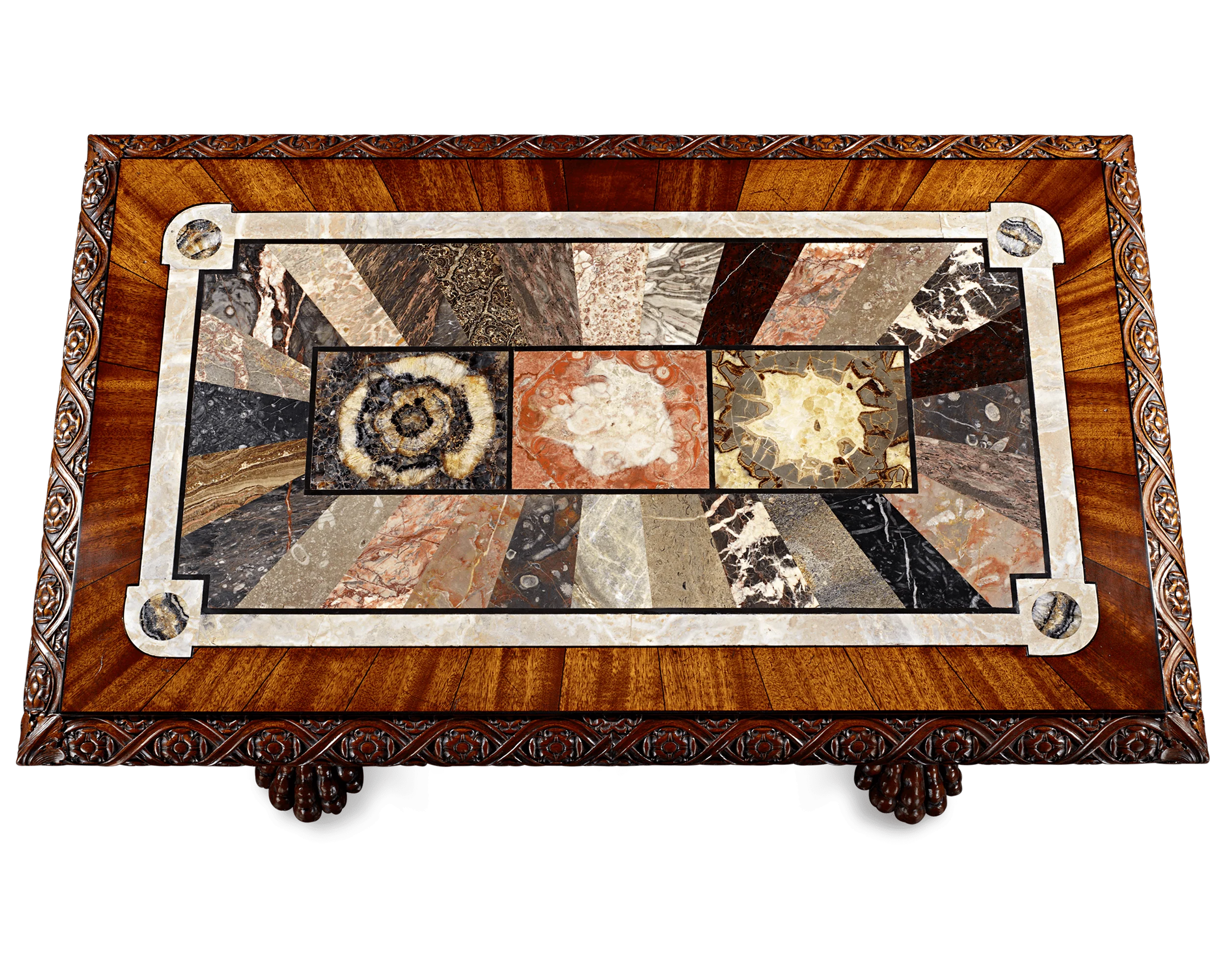 This monumental table is a rare masterpiece of English furniture, custom-made by the Royal Marble Works for an important titled estate. Its striking design combines stunning Blue John and other important British fossil, marble and mineral specimens with exquisitely carved mahogany at an impressive scale, marking it as one of England’s most important tables.