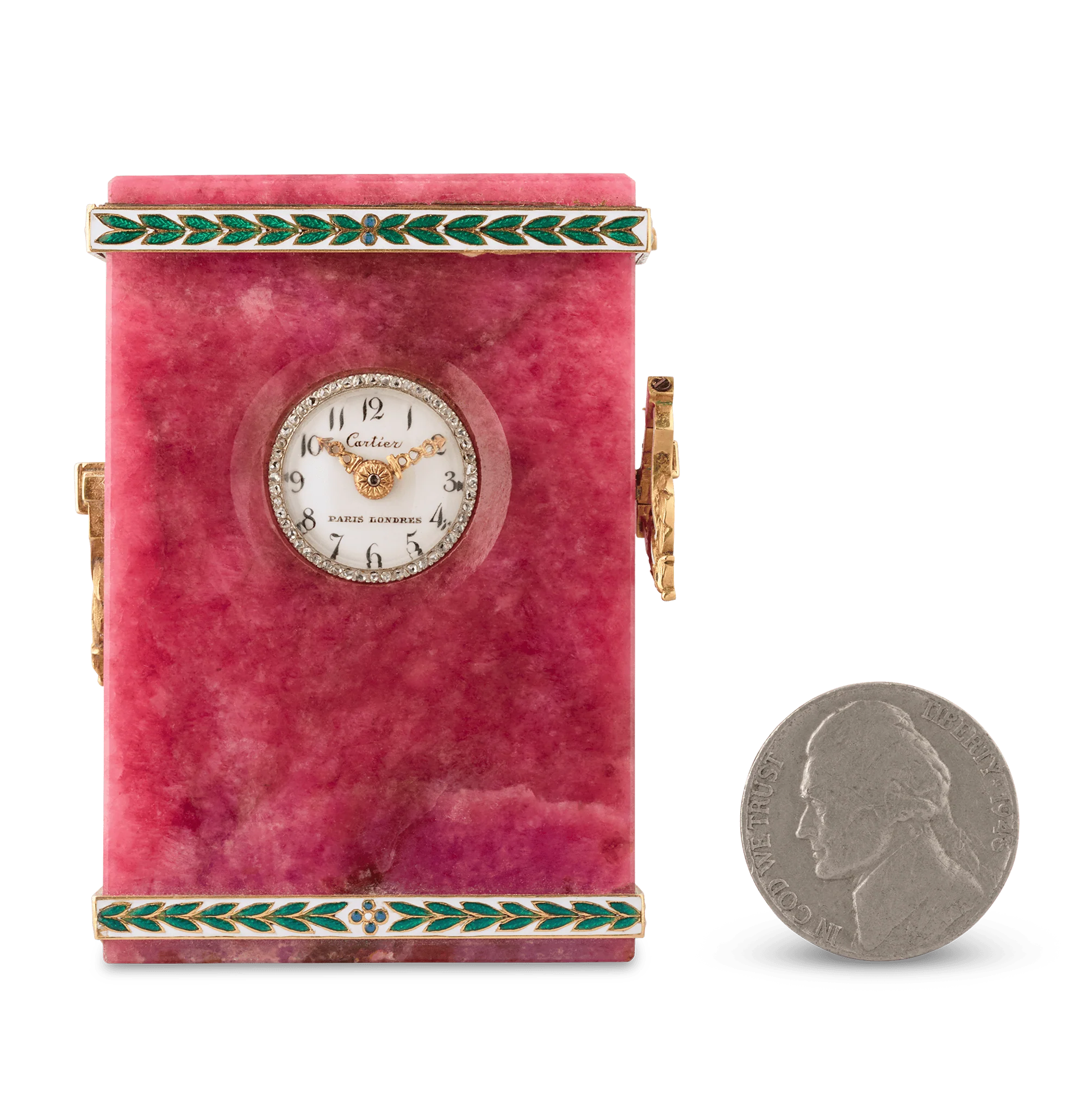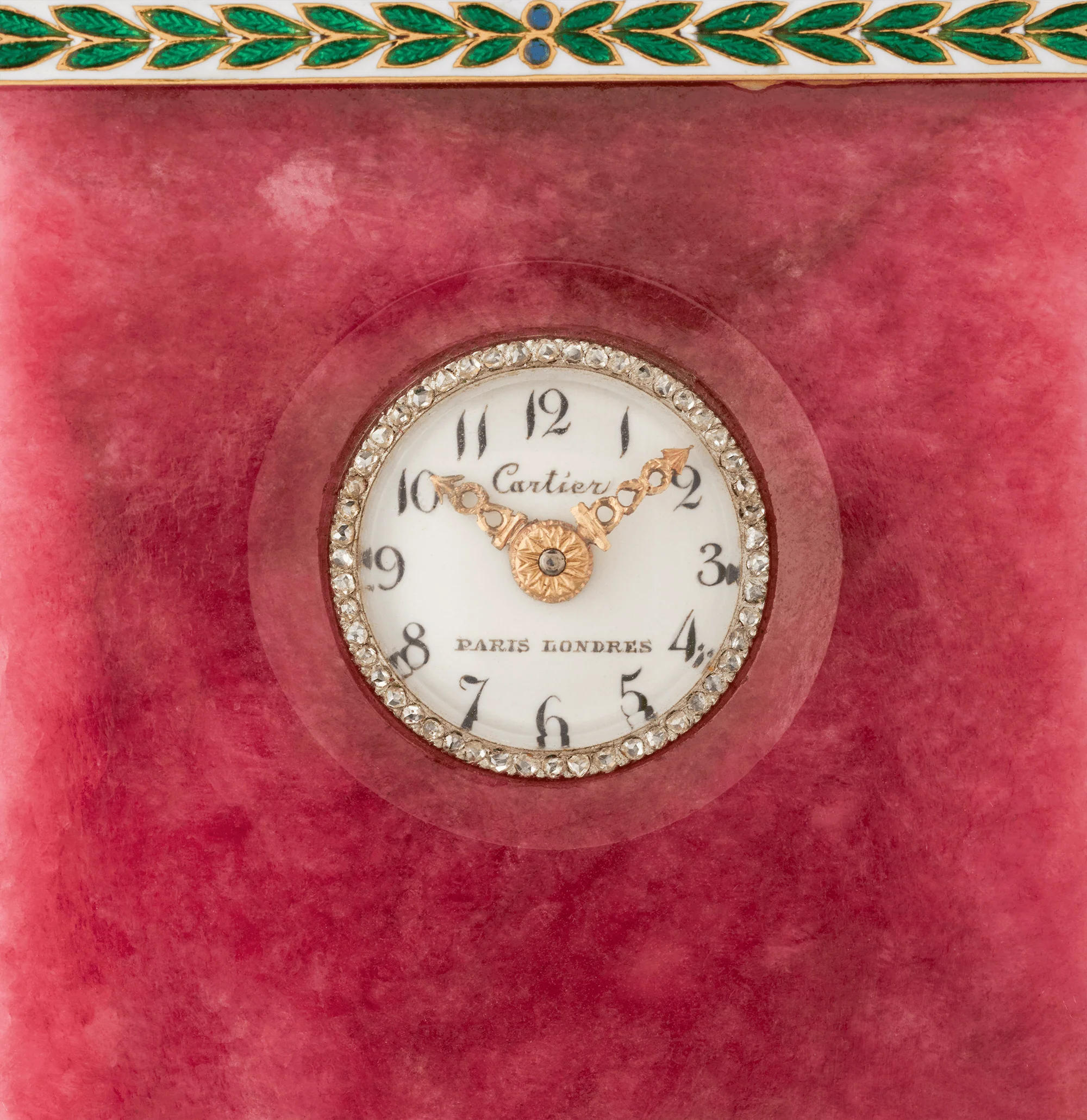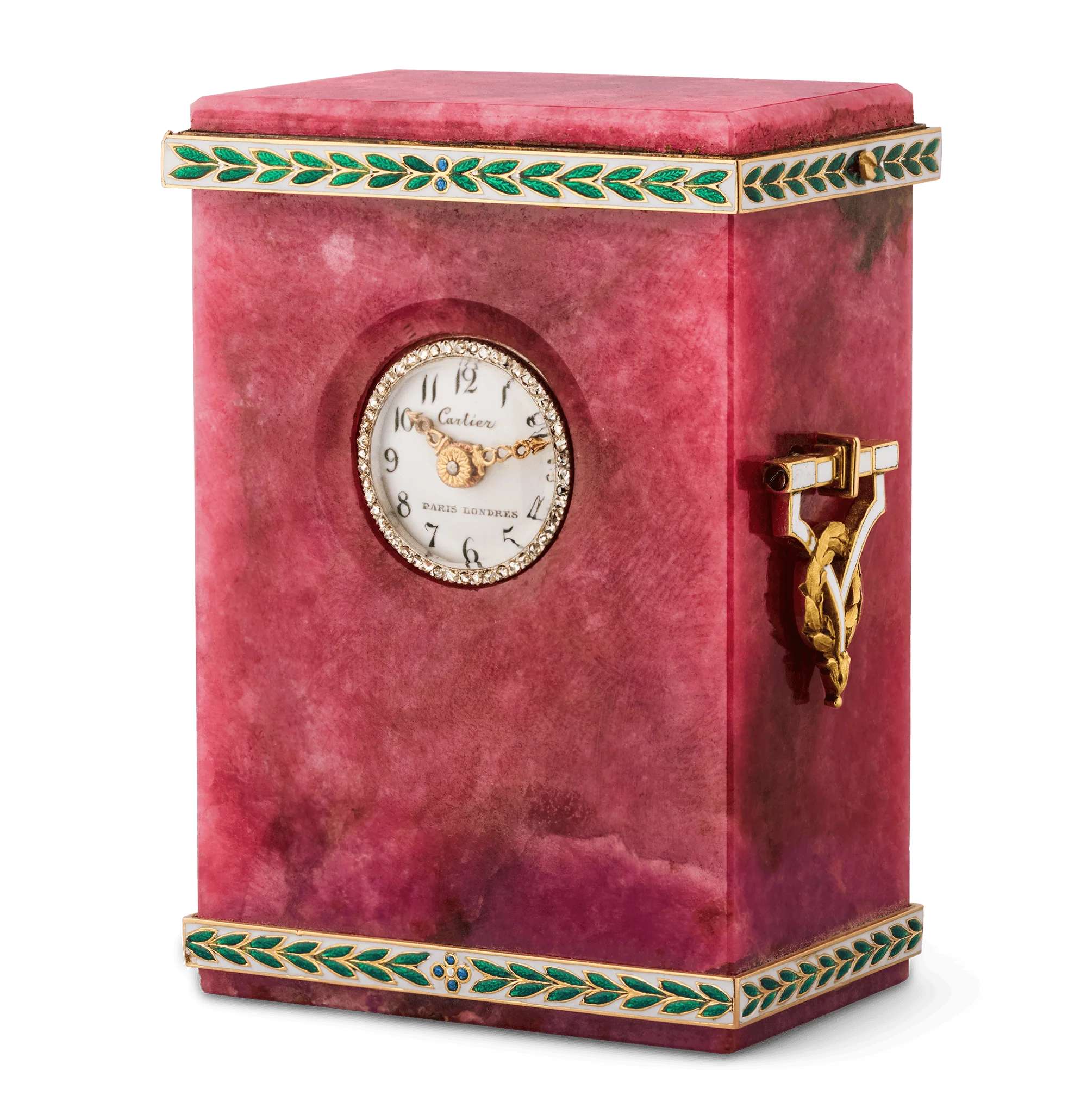 This exceptional Belle Époque boudoir clock by Cartier showcases the rare beauty of rhodonite paired with masterful craftsmanship in gold, platinum, diamonds and enamel. Its rose-red rhodonite body is accented by vivid green and blue enamel laurel motifs, a design motif gracefully echoed in the gilded handles. The white dial, with its black stylized Arabic numerals, is framed by a dazzling diamond-set bezel. These elements exemplify the refinement and artistic excellence that defined the beautiful era.