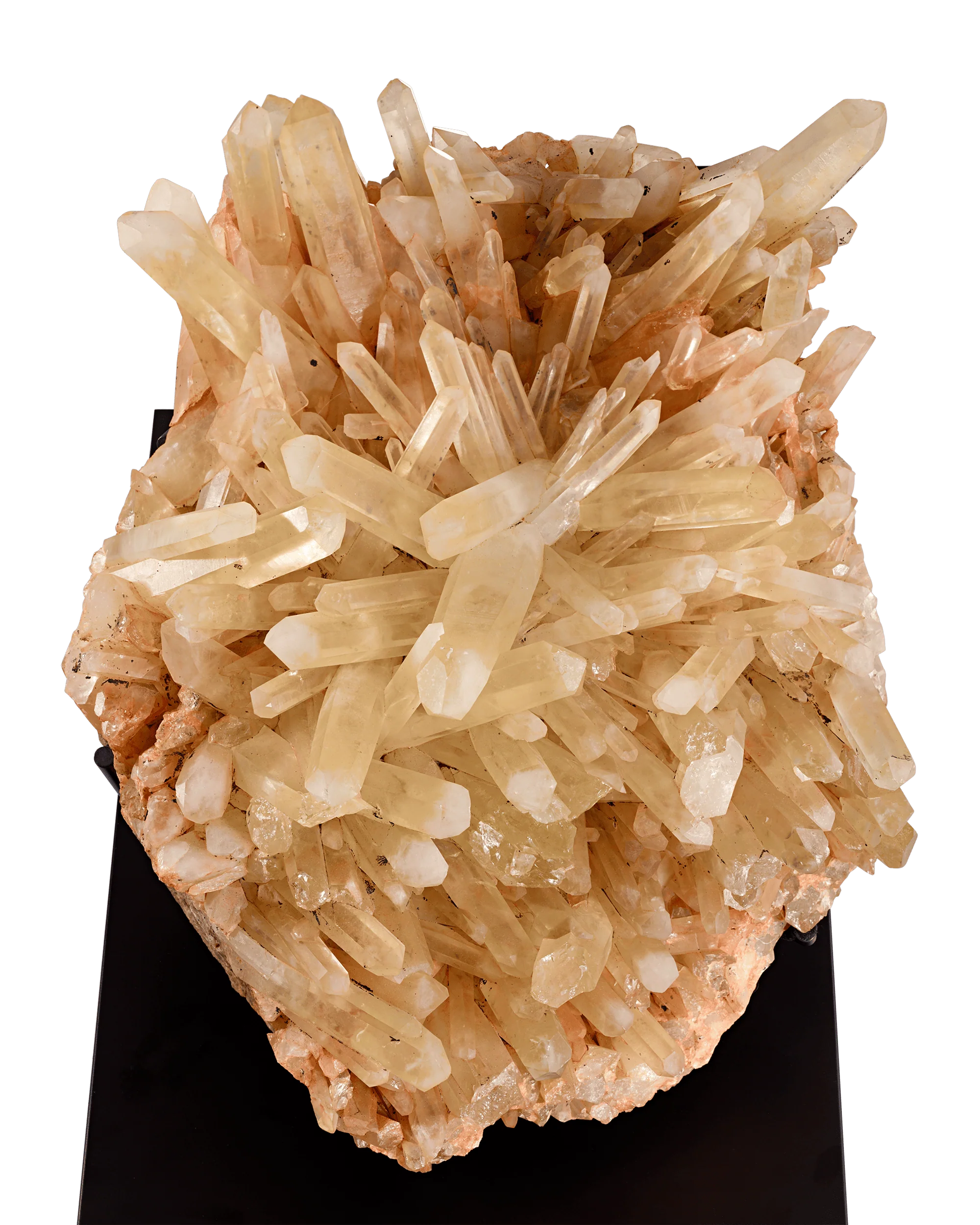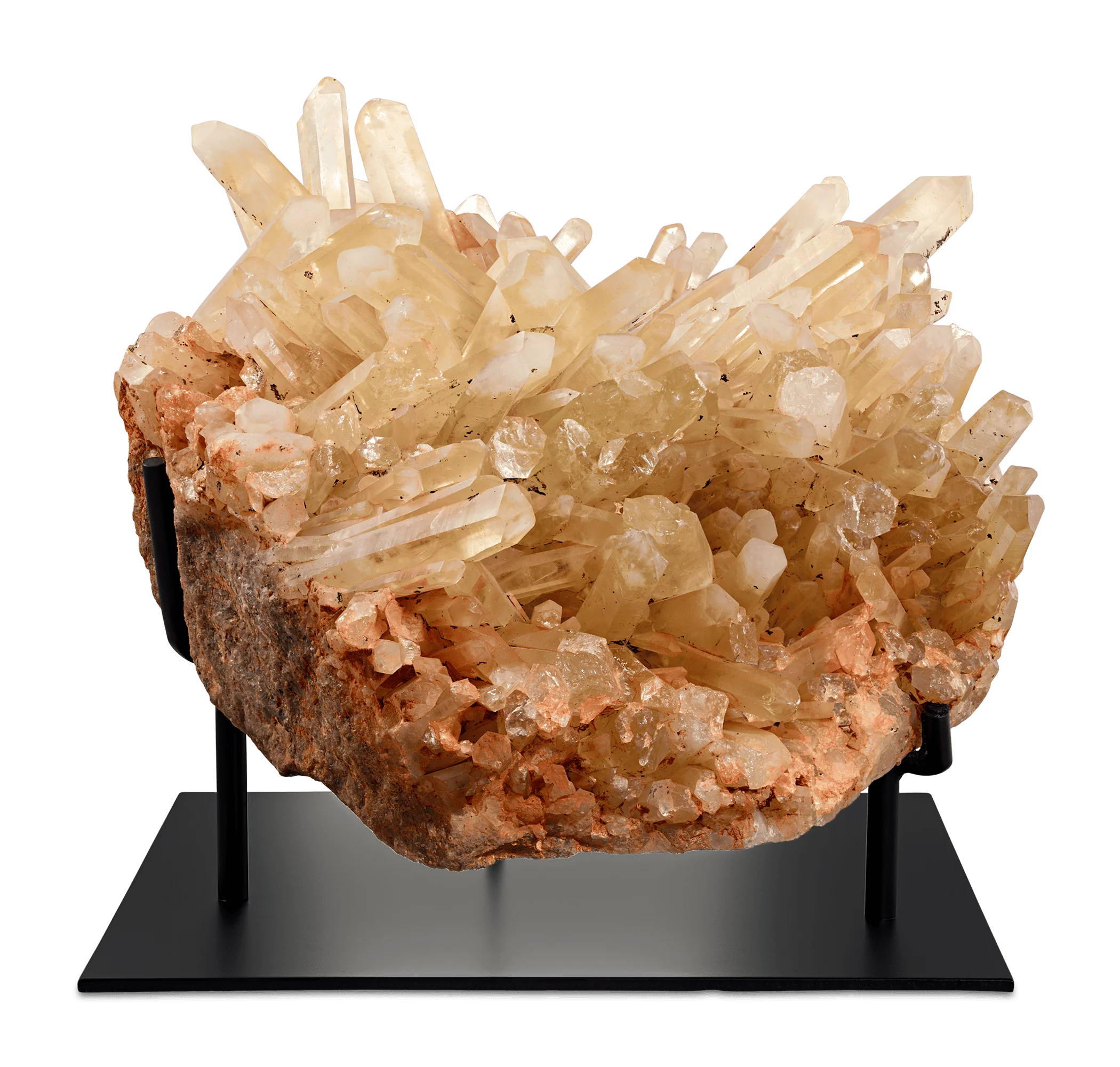 This exceptional mineral specimen displays a radiant cluster of citrine quartz crystals emerging from its natural matrix base. The champagne-hued crystals display crisp geometric terminations, creating a stunning sculpture-like composition. Weighing an impressive 35.65 pounds and measuring 19 3/4″ across, this exceptional specimen is a masterpiece of nature. Examples of this scale and quality are exceedingly rare.