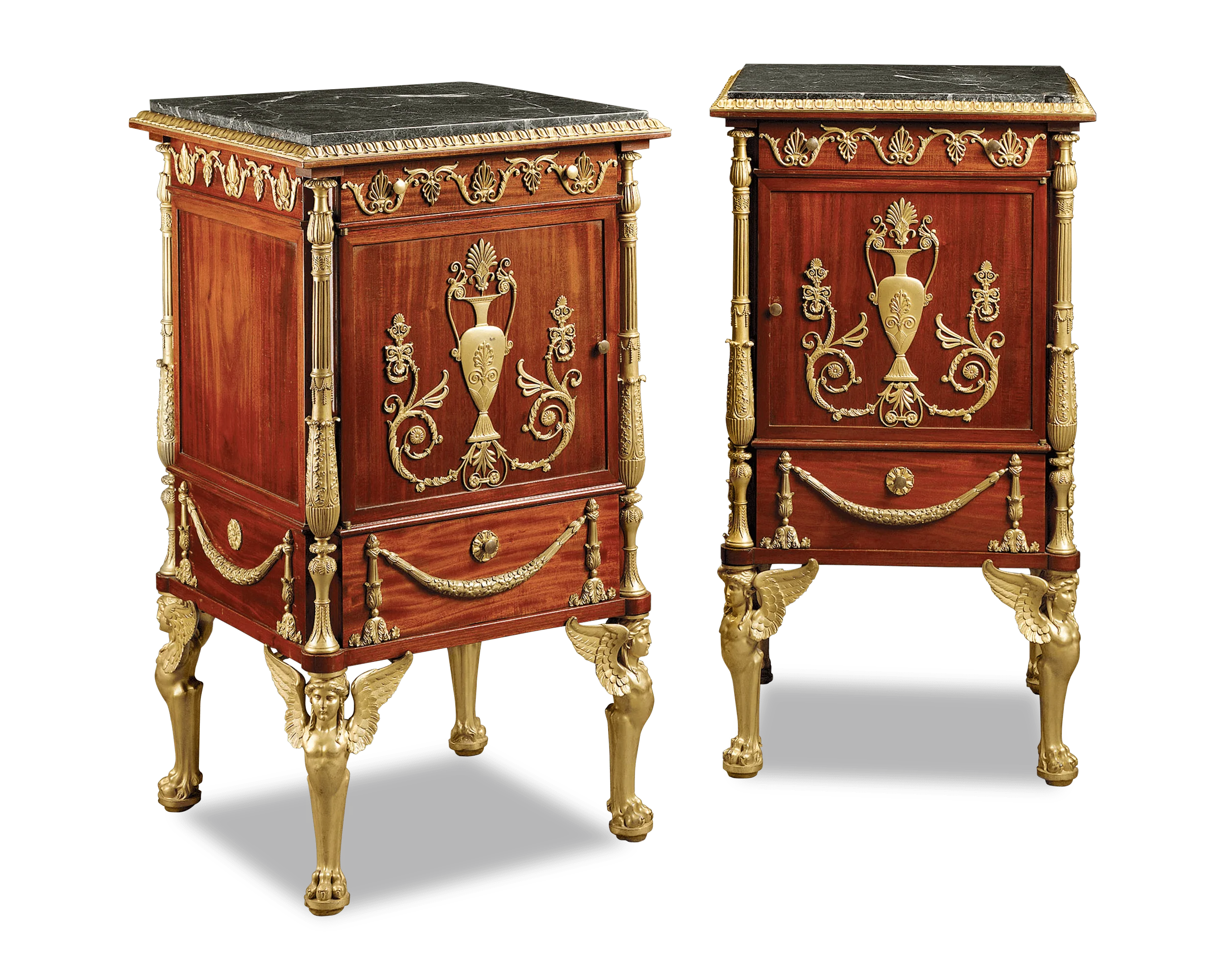 Each piece is phenomenal and was crafted with extraordinary expertise. Most notable are the superior bronze mounts. Inspired by the style created to glorify Emperor Napoleon, the decorative Empire elements radiate royalty, power and elegance. Bronze legs of winged creatures support the vanity and nightstand while the secretary and cabinet rest on large bronze paw feet. Urns, swags and a variety of mythological creatures are all cast and gilded to the finest degree.