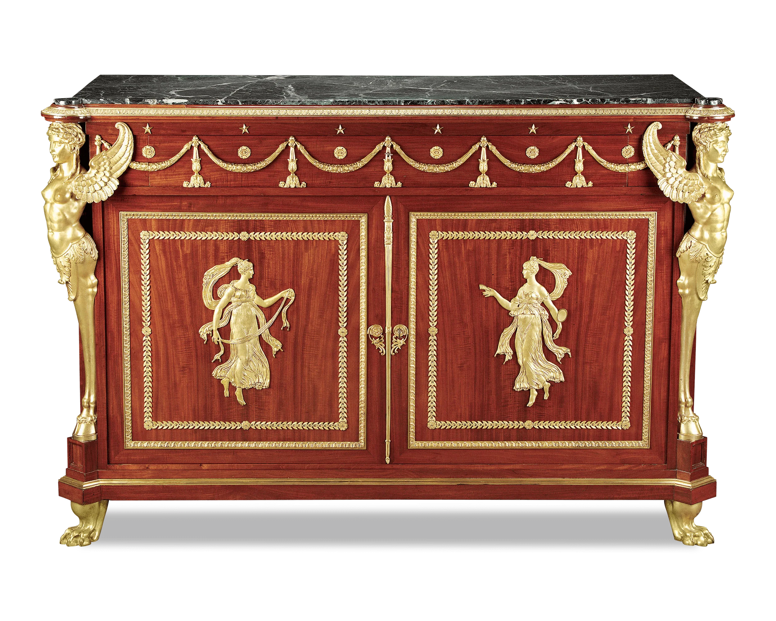 Antoine Krieger took his inspiration for this set from the furnishings of Malmaison, one of Napoleon and Josephine’s Parisian palaces. A similar bedroom suite was acquired by circus magnate John Ringling to adorn his bedroom at Ca d’Zan, now part of the John and Mable Ringling Museum of Art in Sarasota, Florida.