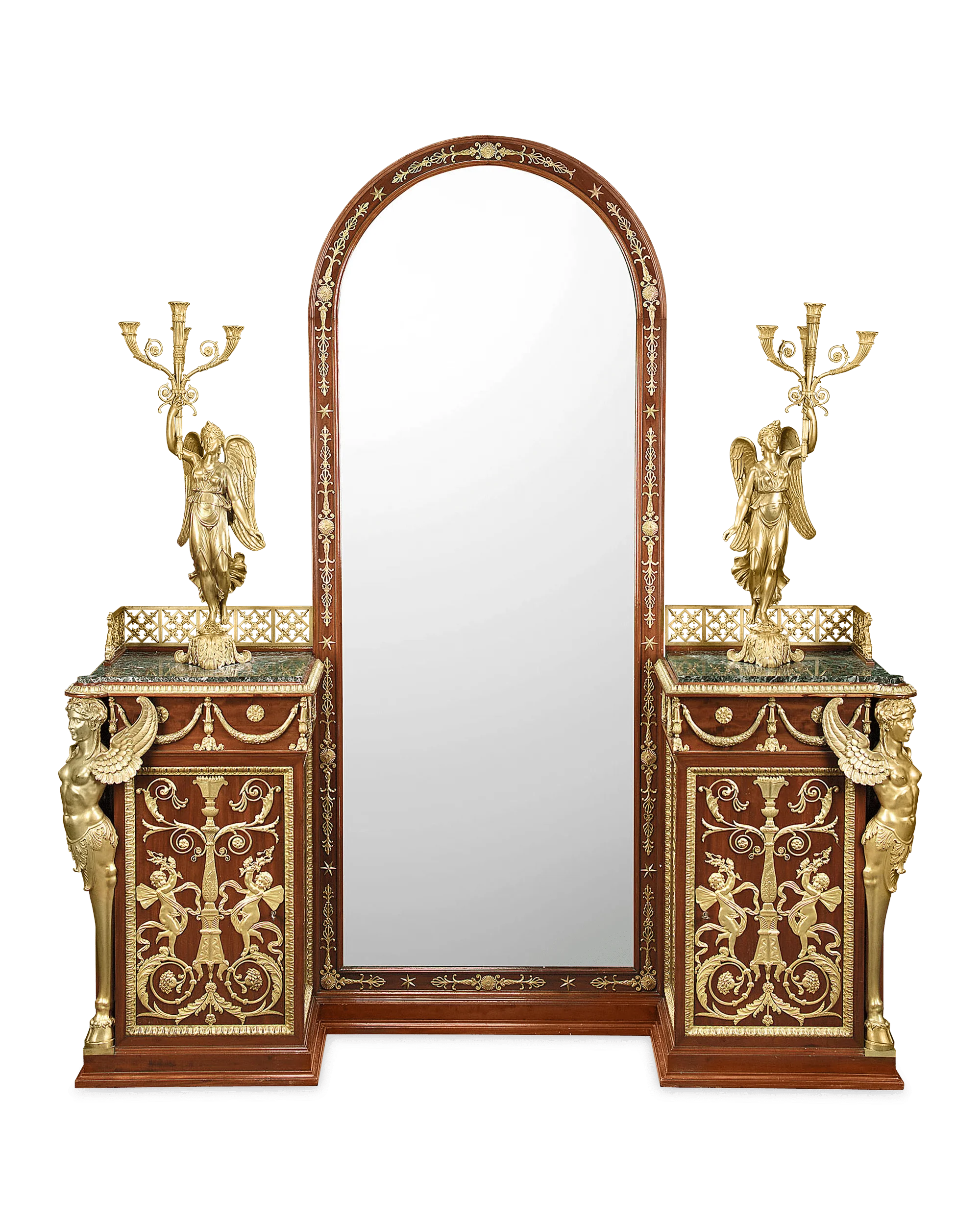 This extraordinary mahogany and mercury-gilded bronze bedroom suite was almost certainly once owned by 19th-century Egyptian royalty. Luxuriously decorated in the Empire style, this important set was crafted by one of the premier Parisian ébénistes of the 19th century, Antoine Krieger (1804-1869). The seven-piece suite comprises a queen-size bed, secrétaire à abattant (drop-front secretary) with a satinwood interior, cheval mirror with side tables, two-door cabinet, vanity and two nightstands. The abattant, tables of the cheval mirror, cabinet and nightstands are all fitted with beautiful green marble tops.