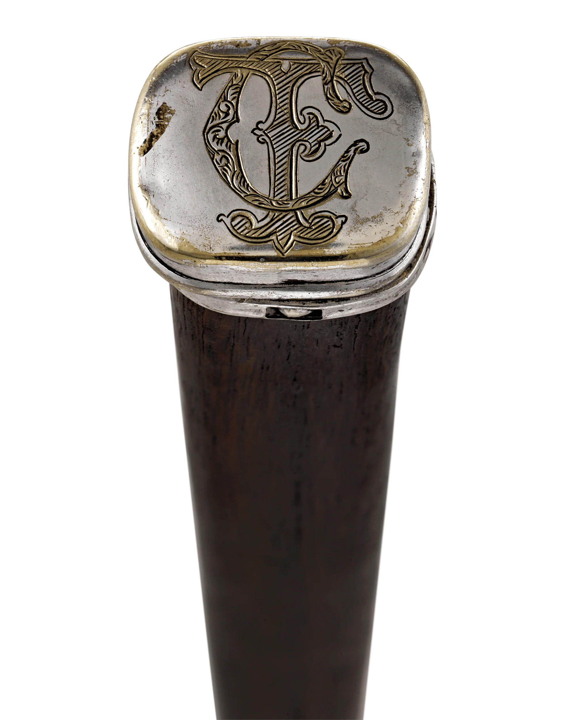 A truly elegant accessory for the well-dressed Victorian woman, this English silver-topped mahogany cane holds a delicate fan within the shaft. The silver knob opens to a compartment where the beautifully detailed fan is kept.