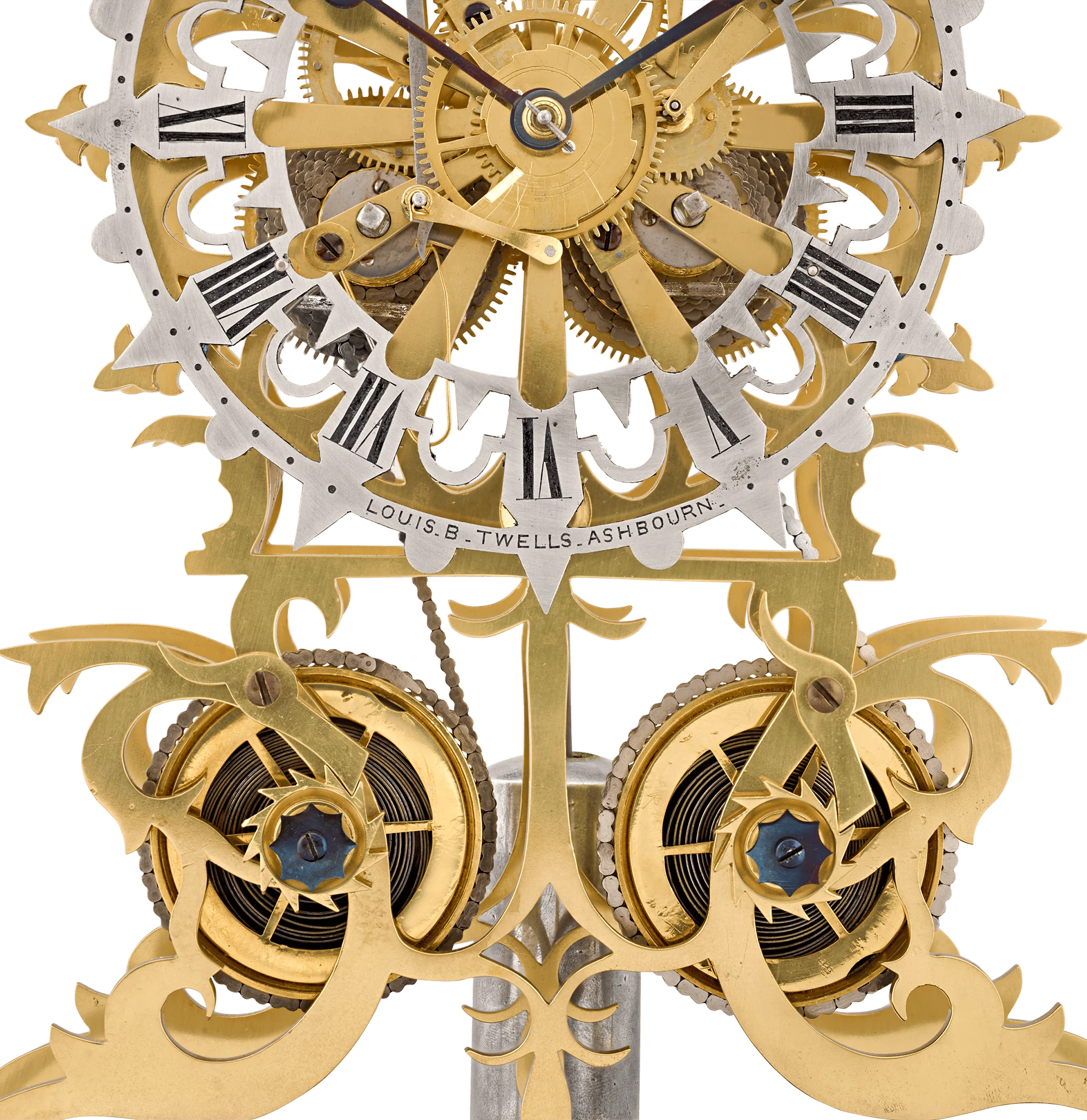 Evans of Handsworth established themselves as premier manufacturers of skeleton clocks during the mid-19th century, earning recognition for producing some of the most technically sophisticated and visually striking timepieces of the era. Operating from their Birmingham workshop, the firm specialized in complex movements housed within architecturally inspired frames that appealed to Victorian fascination with both Gothic Revival aesthetics and mechanical innovation. The clock was retailed by Louis B. Twells of Ashbourne.