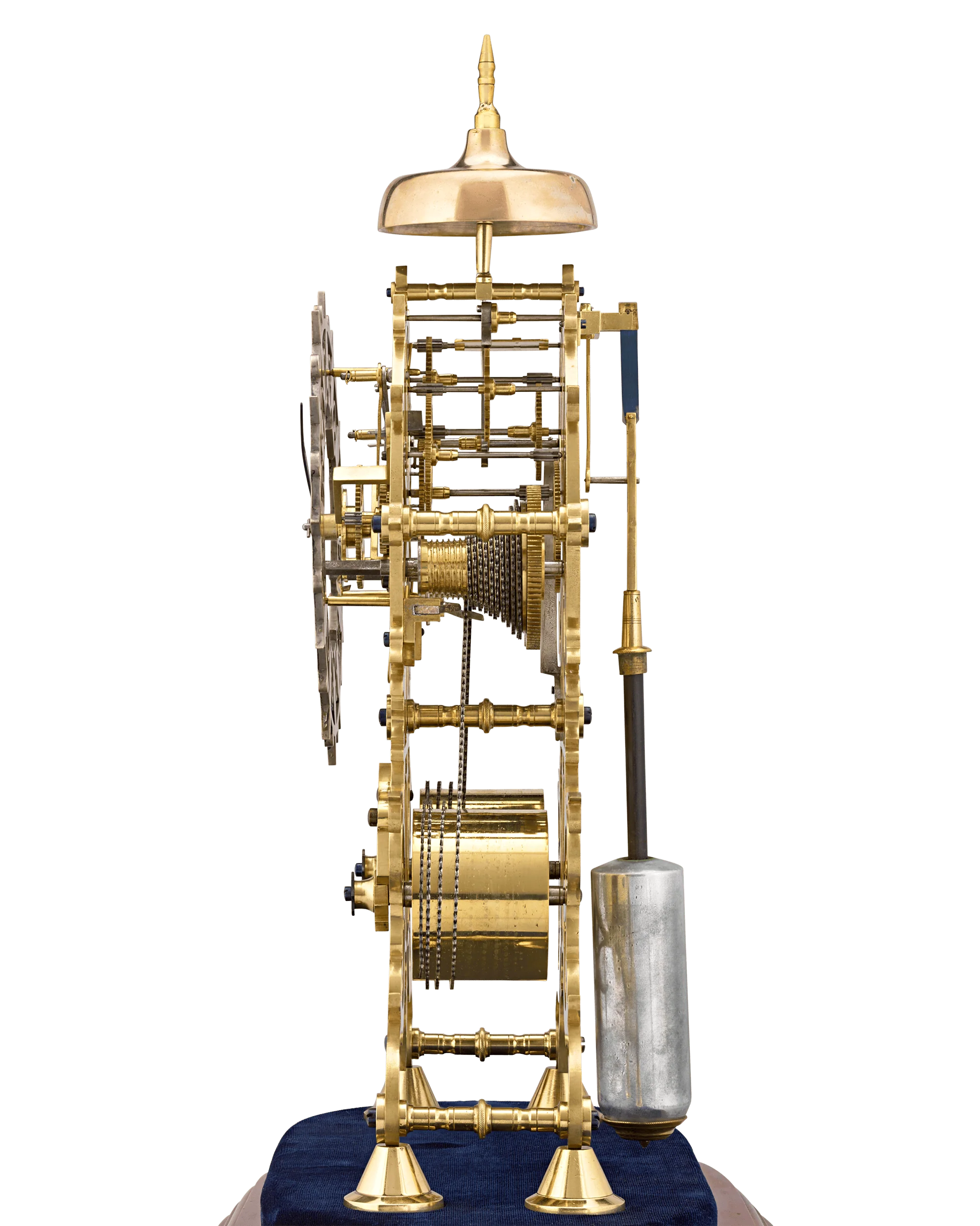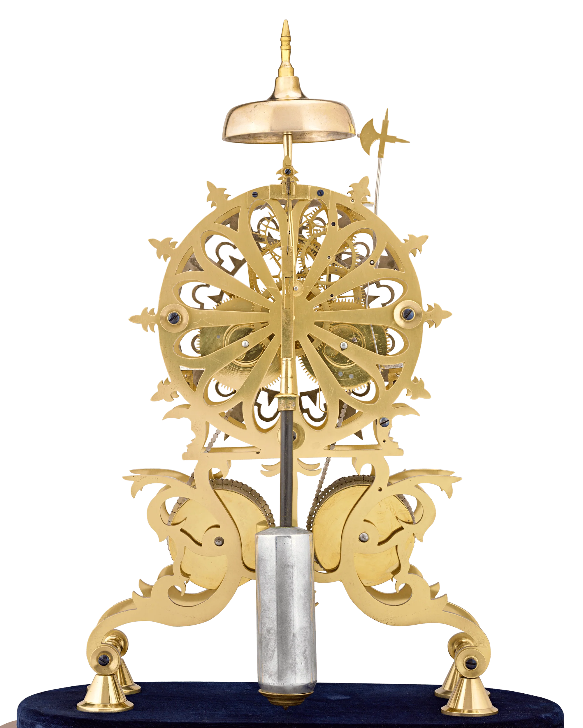 This exceptional skeleton clock transforms the grandeur of Notre-Dame Cathedral’s rose window into a functioning horological masterpiece. Created by the celebrated firm Evans of Handsworth during the height of Victorian clockmaking excellence, this timepiece represents the pinnacle of 19th-century English mechanical artistry. The 8-day, 2-train fusee movement strikes on the hour and half-hour, while the intricate pierced dial mimics the Gothic style of the Cathedral’s famed stained glass. Each brass spoke and arch has been meticulously pierced and finished, revealing the complex fusee movement beneath while maintaining the clock’s architectural inspiration.