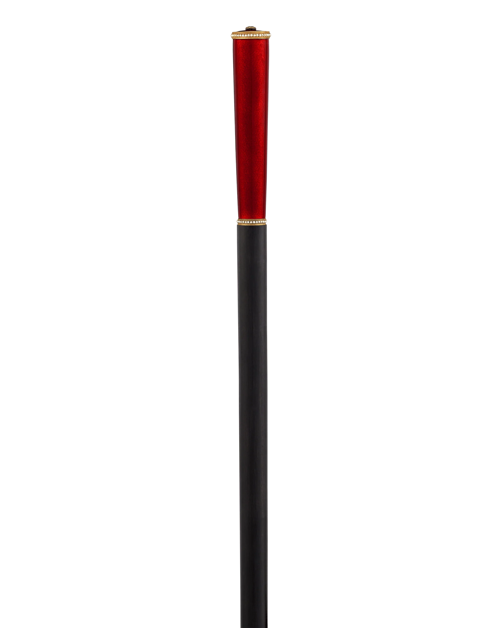 This elegant walking stick is topped by an exquisite Fabergé handle enveloped in crimson red guilloché enamel and yellow gold mounts. Crafted with undeniable charm and taste during the iconic tenure of Carl Fabergé, this luminescent handle is emblematic of Fabergé’s most spectacular work. Topped with a beautiful peridot and lined with delicate bands of pearls, the cane demonstrates the pinnacle of refinement.