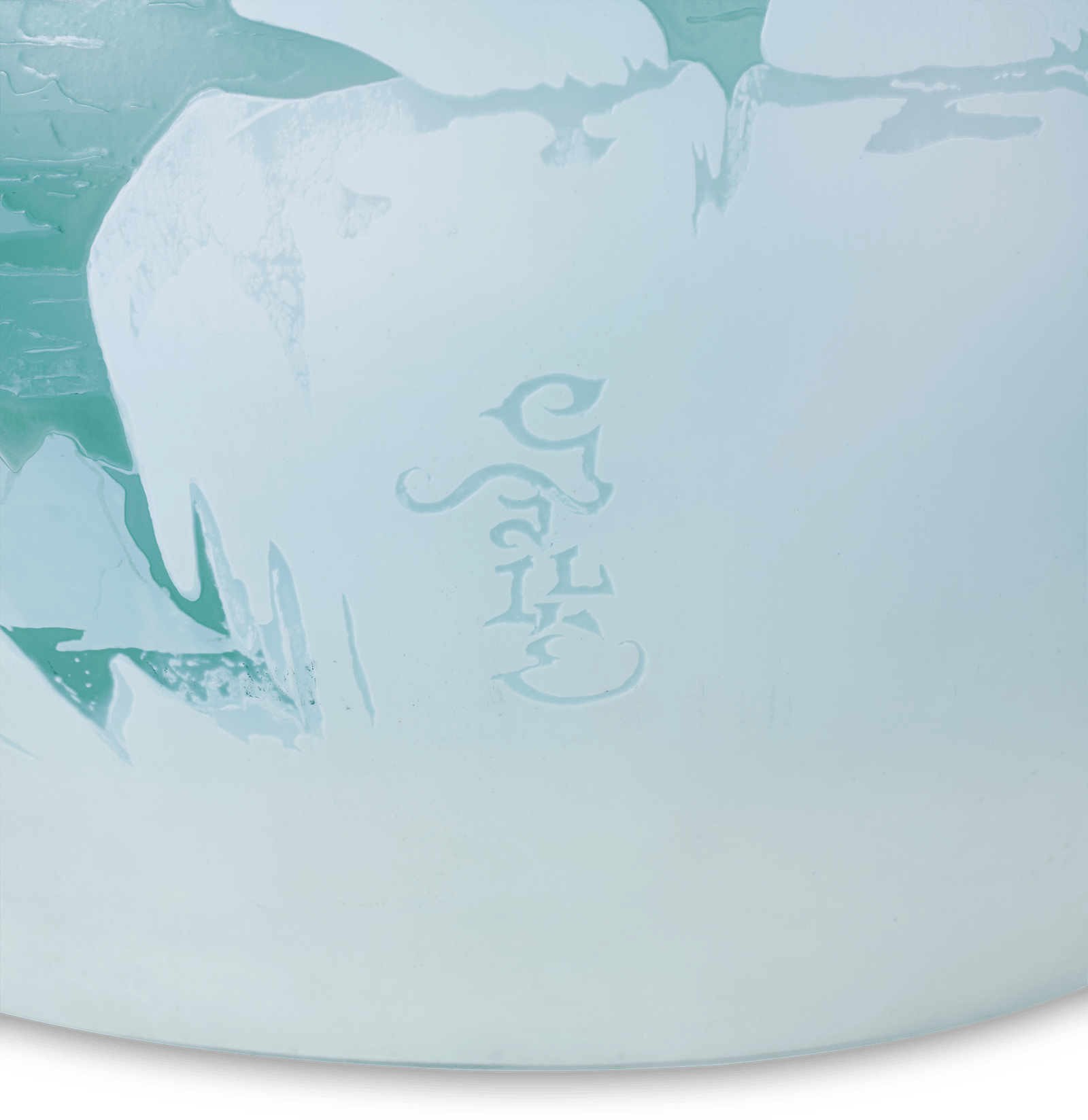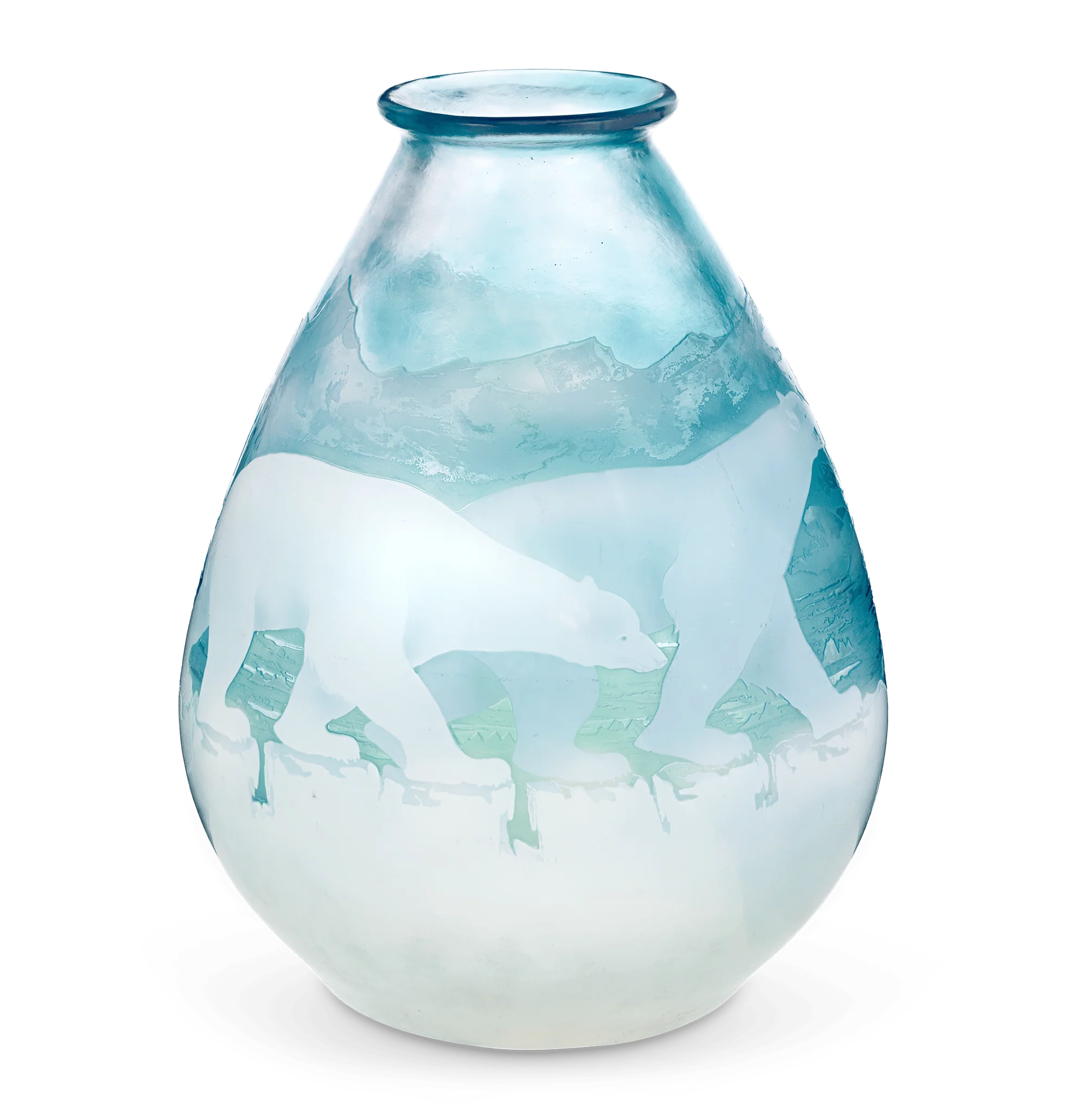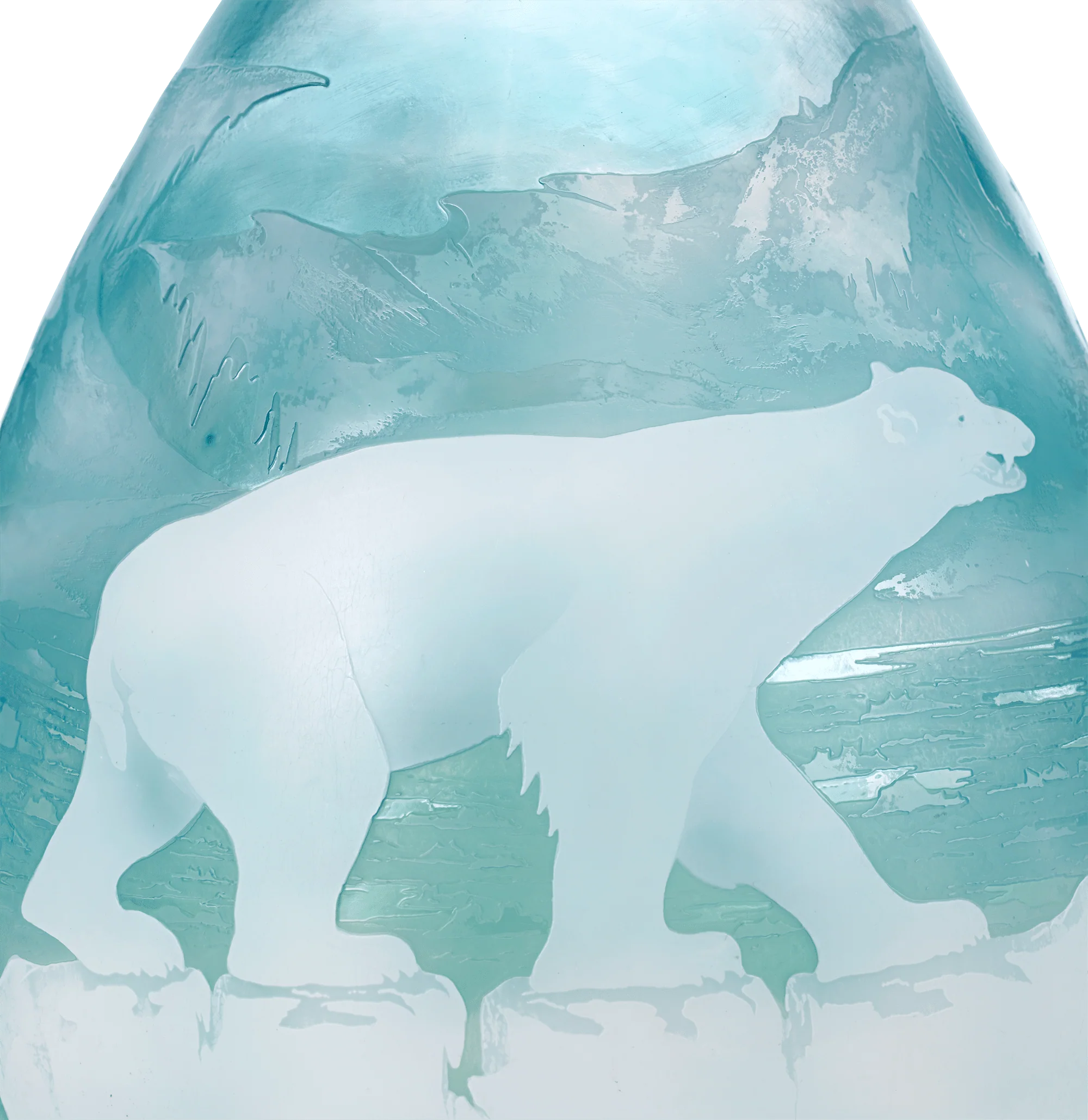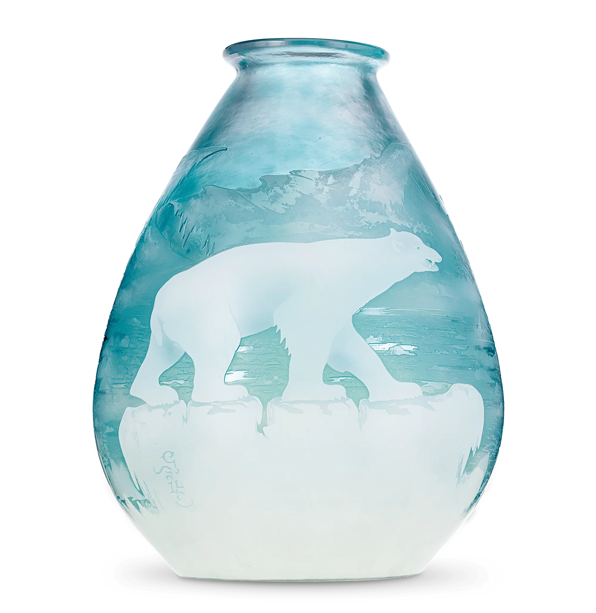 The vase’s impressive scale required an extraordinary amount of glass and heightened craftsmanship to achieve its intricate details. It depicts polar bears adrift on an ice floe, framed by distant mountains and an icy blue backdrop. The use of layered opaque cameo glass makes the bear appear to be floating among the ice, creating a captivating, three-dimensional effect that was simply unmatched by Gallé’s peers.