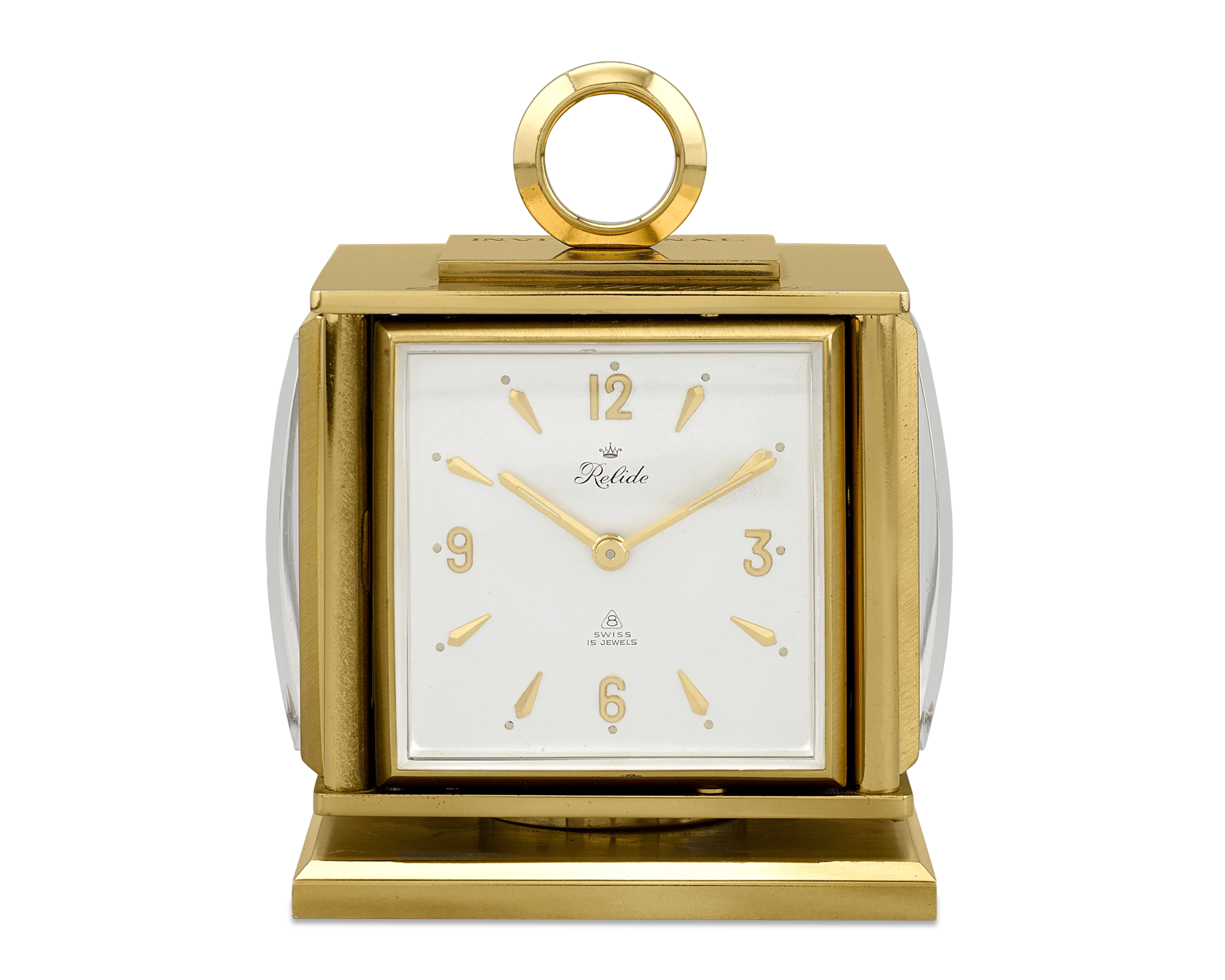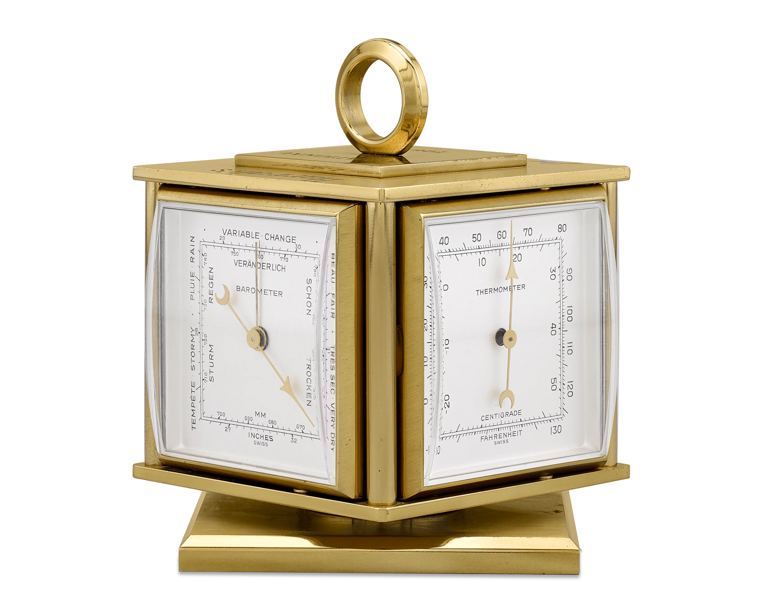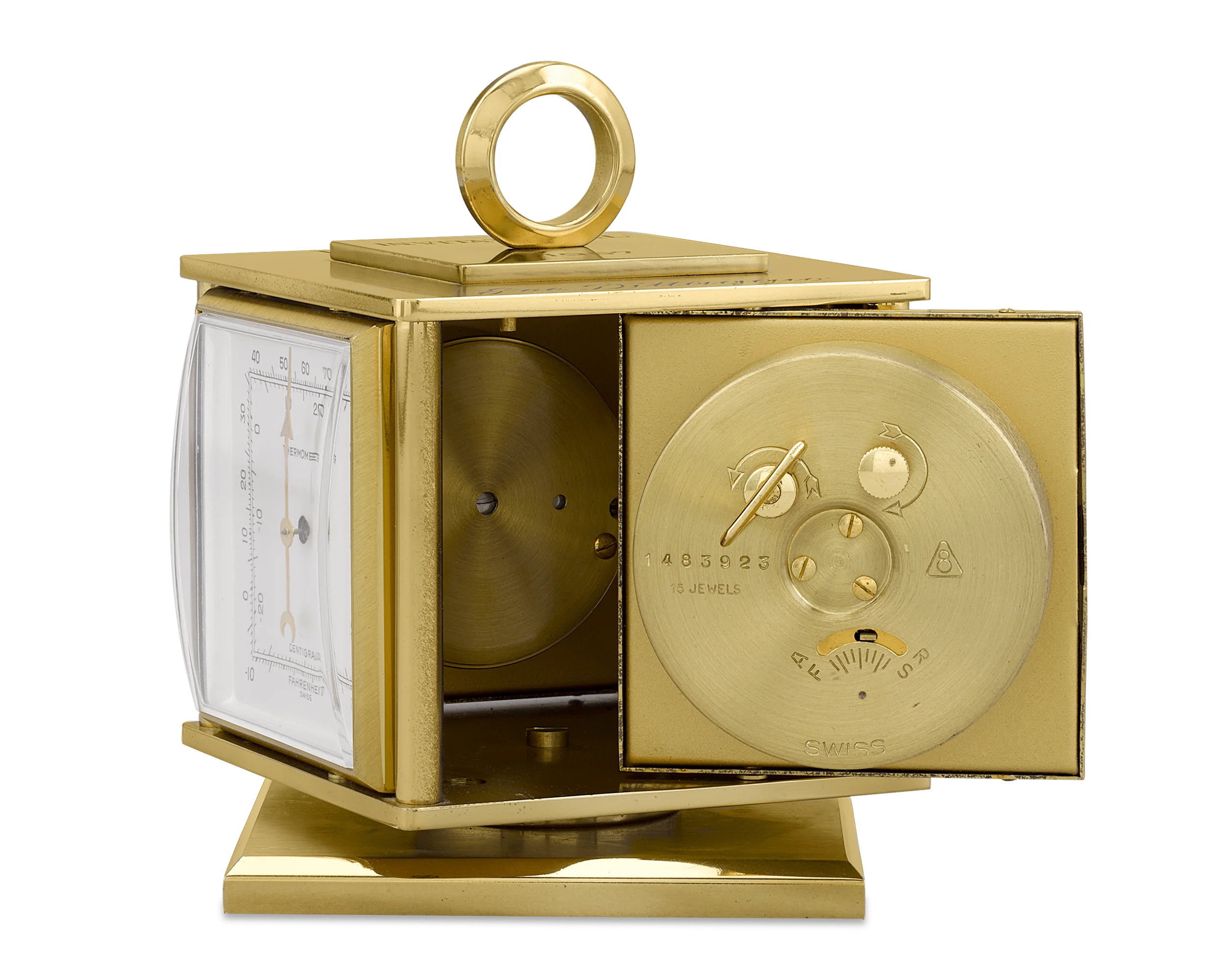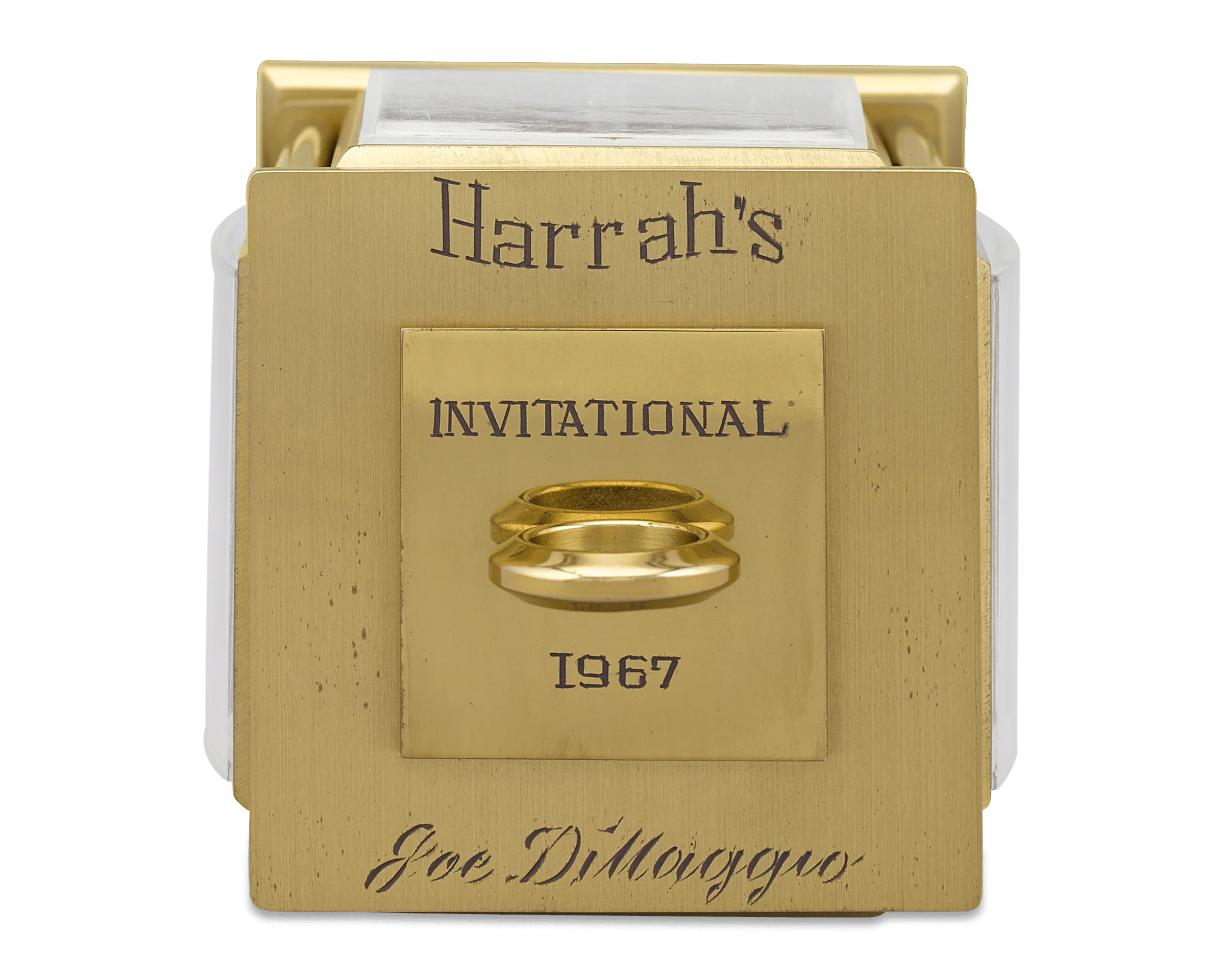 From the personal collection of the legendary Joe DiMaggio, this incredible vintage desk clock was presented to the Yankee Clipper by Harrah’s for his participation in their 1967 invitational golf tournament. The Swiss timepiece was retailed by Relide of New York and features a brass cube-form body that rotates easily between four separate indicators: a clock, a thermometer, a barometer and a hygrometer (to measure humidity). The top bears the engraving “Harrah’s / Invitational 1967 / Joe DiMaggio”, and a label applied to the base indicates this clock is indeed from the collection of the American baseball icon.