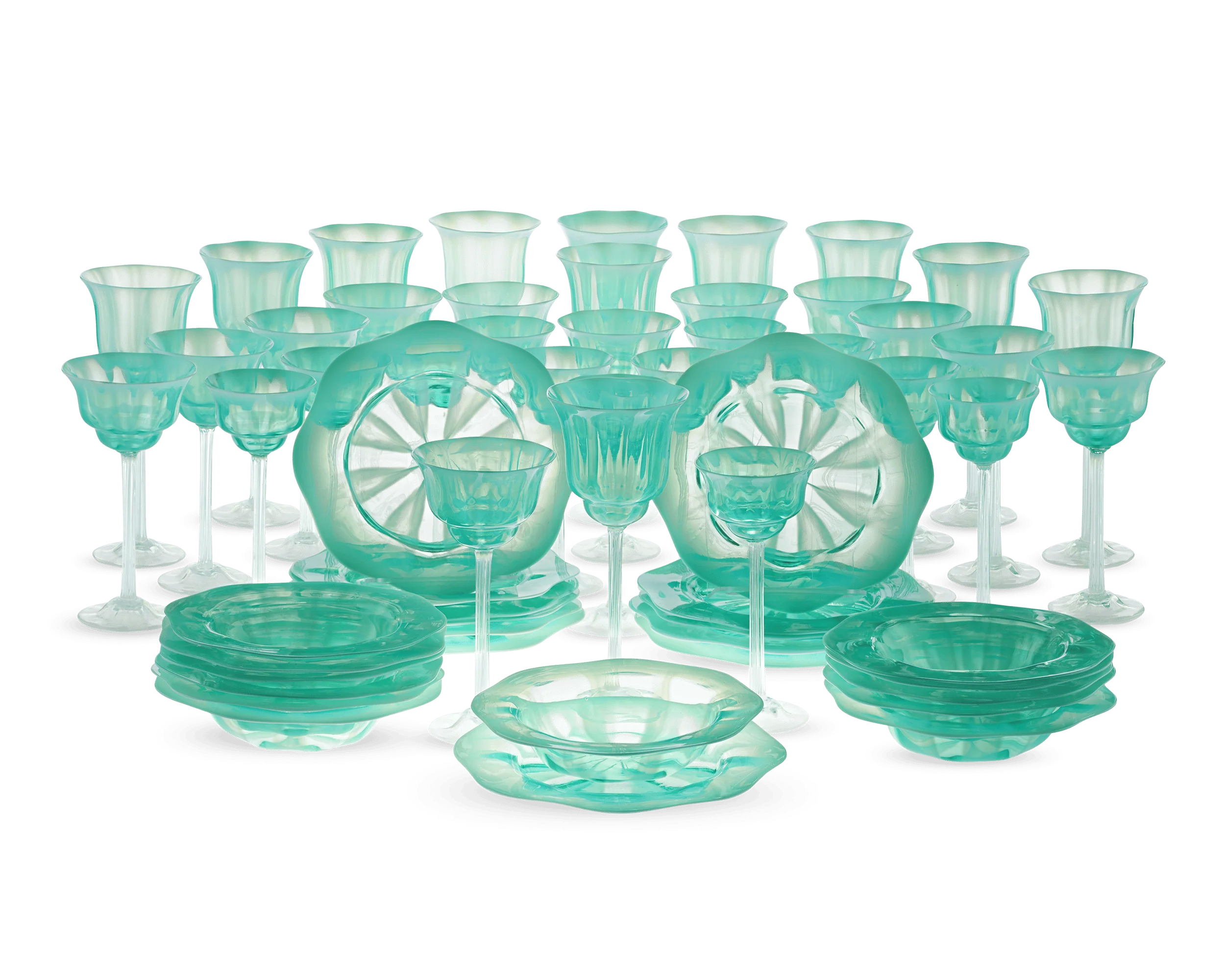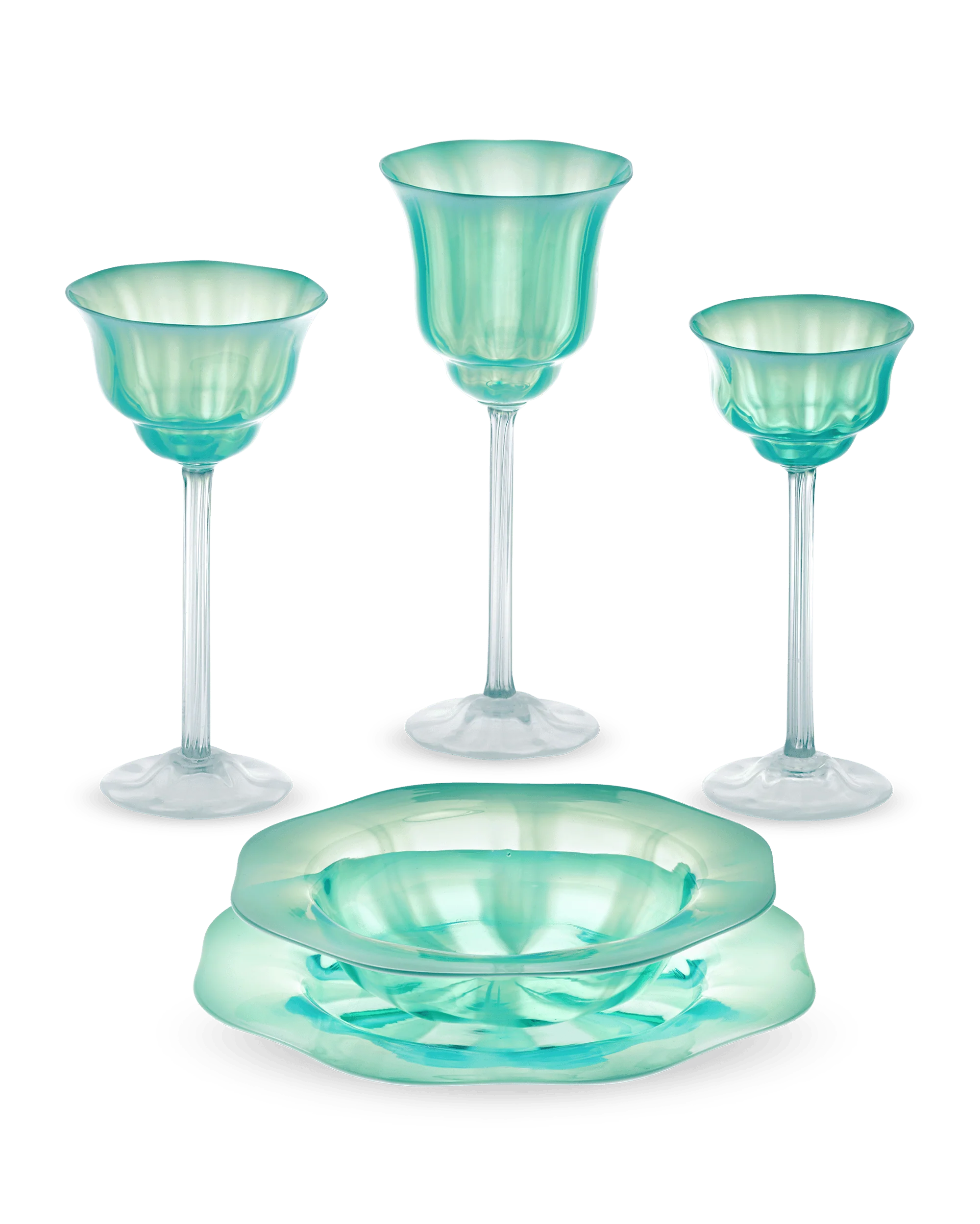 Exuding the elegance of Art Nouveau design, this dinnerware service for 10 from Tiffany Studios is composed of pastel-hued, opalescent green Favrile glass. The plates, bowls and glasses feature a striking light green color with slightly scalloped rims, mimicking naturalistic forms and motifs that defined the age. Delicately crafted and remarkably brilliant, this dinner service epitomizes the luminescent style that Tiffany is famous for perfecting.