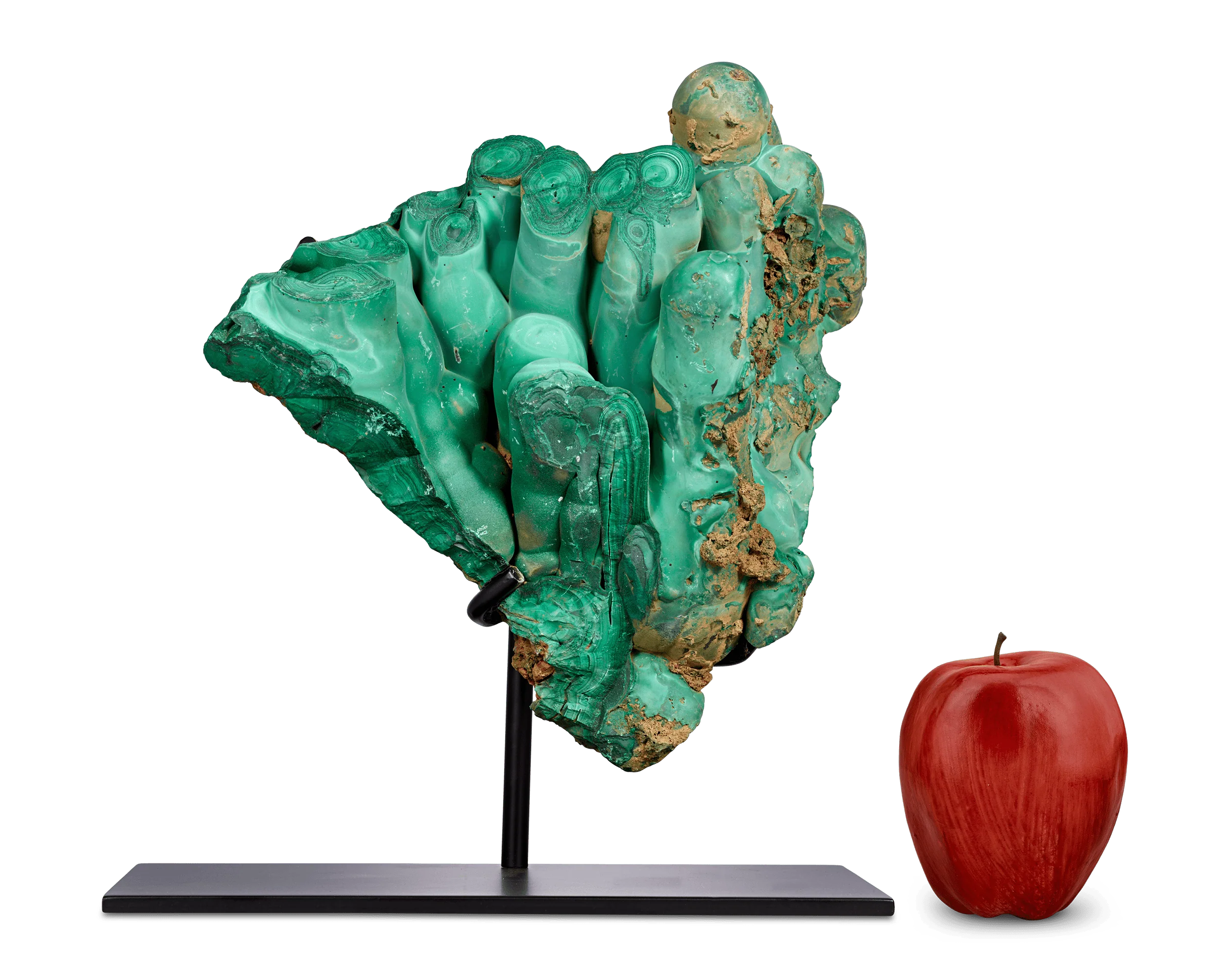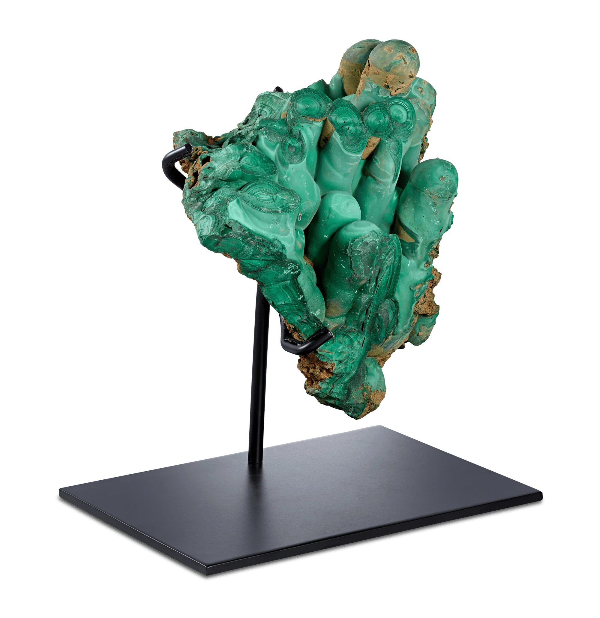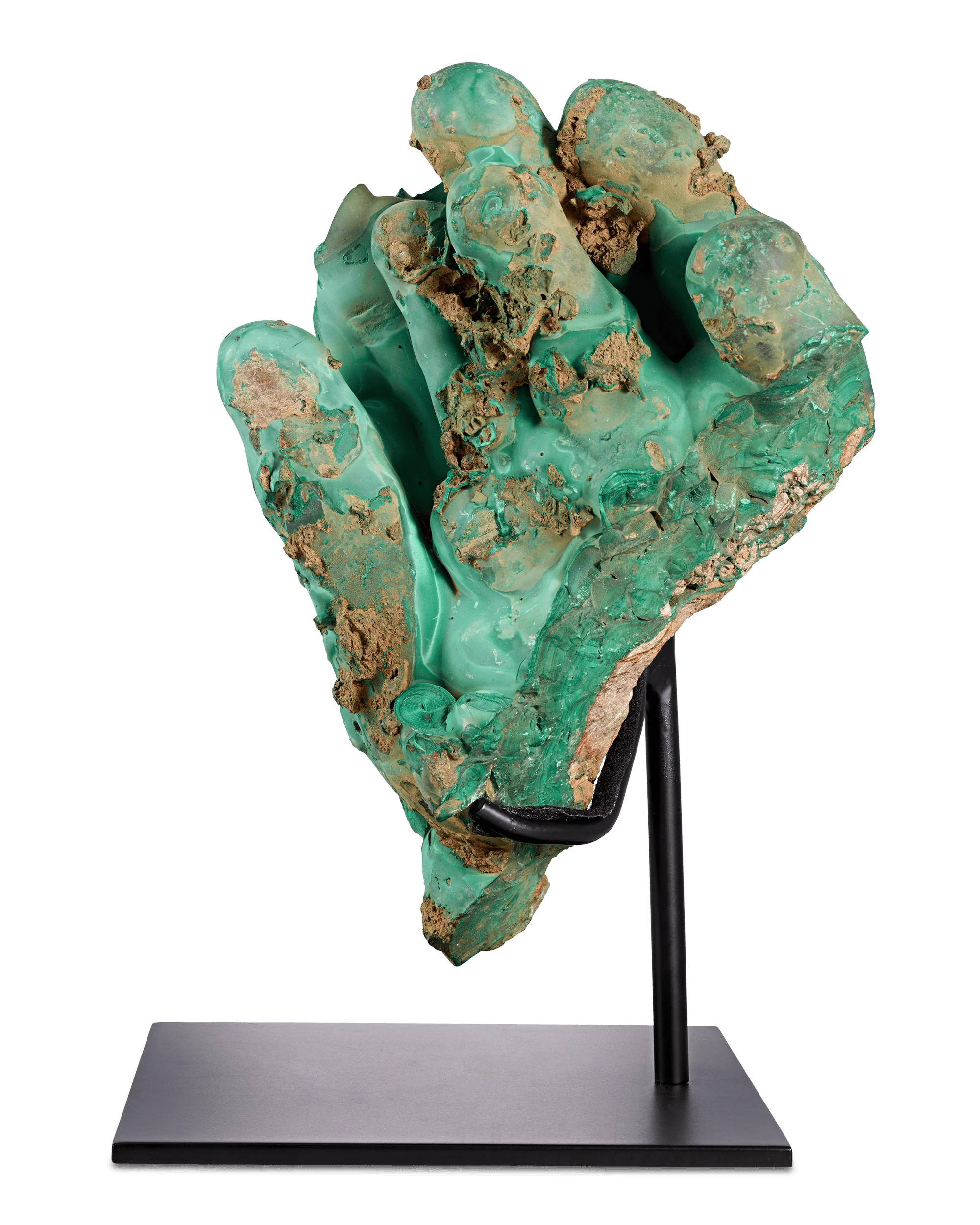 This exceptional natural malachite specimen is mounted on its metal stand, highlighting its striking botryoidal formation and a rich spectrum of emerald to turquoise green hues, characteristic of the finest malachite. The deeply textured surface creates an extraordinary sense of depth and movement, making it a standout example of natural artistry that bridges the line between mineral specimen and sculptural object. Weighing an impressive 7.89 pounds, this specimen commands attention from every angle.