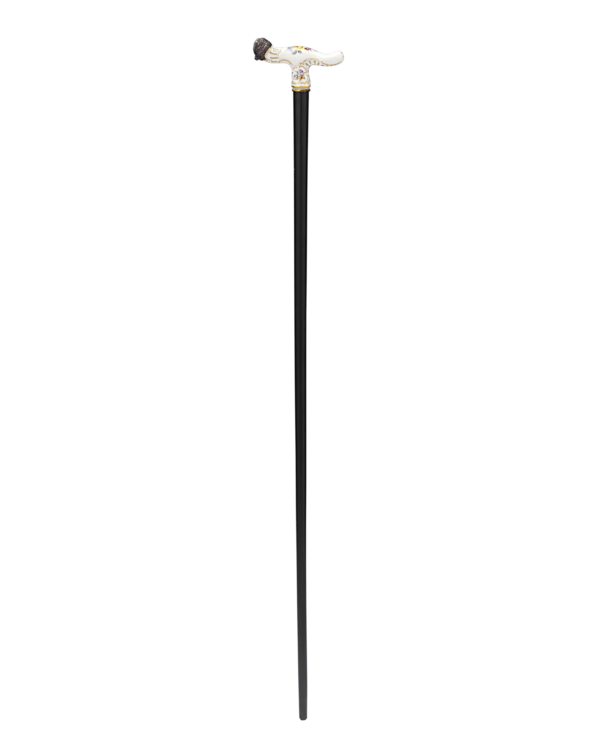 The figural handle of this exquisite walking stick is crafted of fine Meissen porcelain. Showcasing the manufactory’s brilliance in depicting floral motifs and figures, the intriguing woman atop the cane dons a veil.