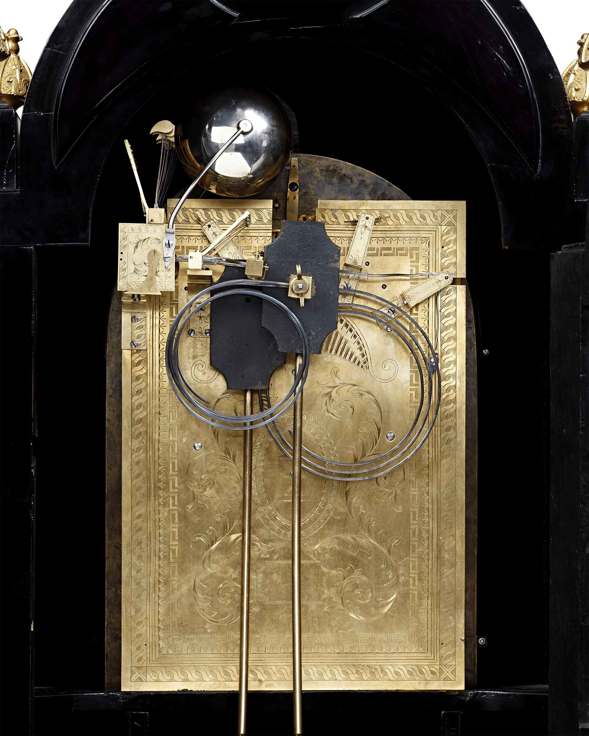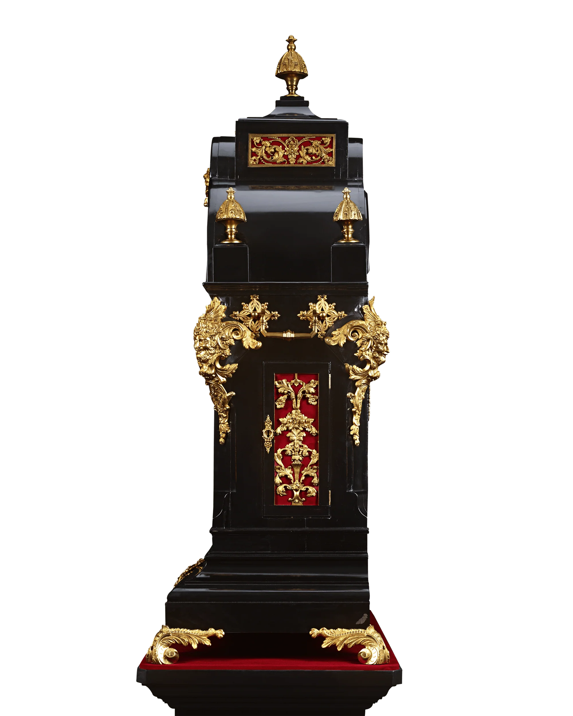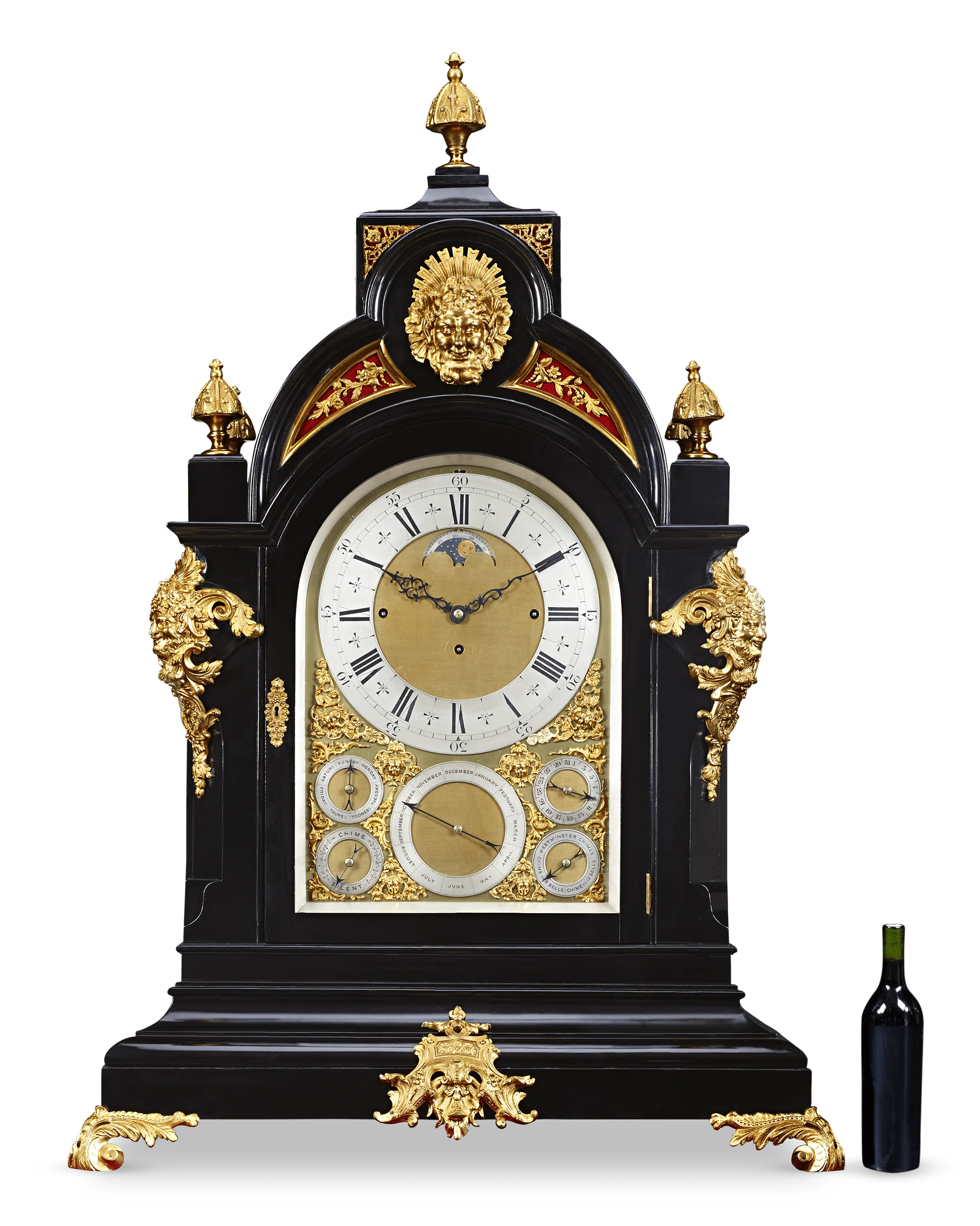 The exterior of the clock adds further visual interest. The lustrous ebonized body is accented by elegant gilt bronze, forming scrolling acanthus leaves, five crowned finials and mask motifs. The clock’s face is intricately detailed with a total of six dials to indicate the time, date, day of the week and month of the year, as well as dials for multiple chime settings. Each bronze dial is encircled and crowned by foliate motifs and cherub faces. Every aspect of this clock displays expert craftsmanship, making this timepiece a visual delight.