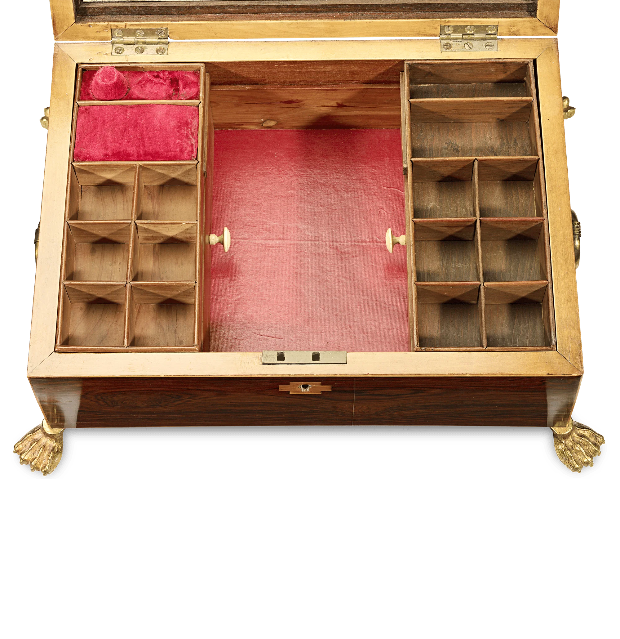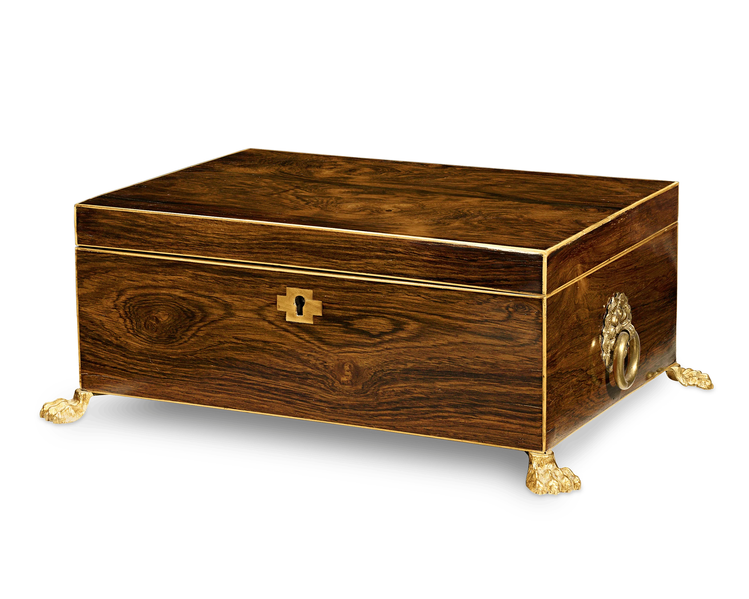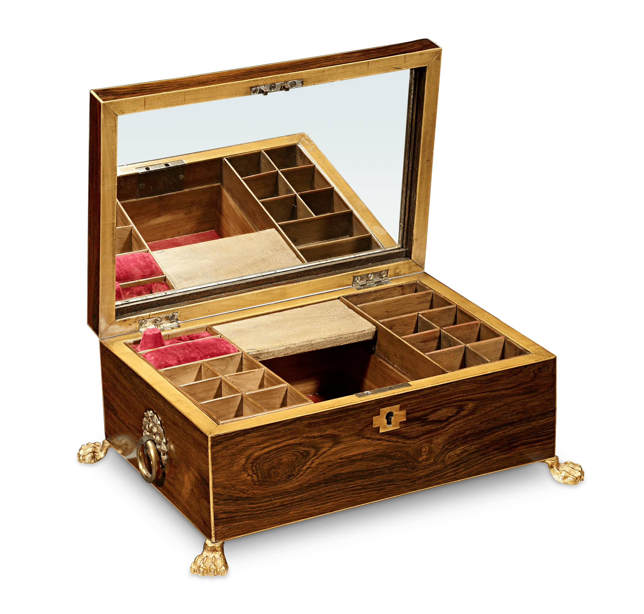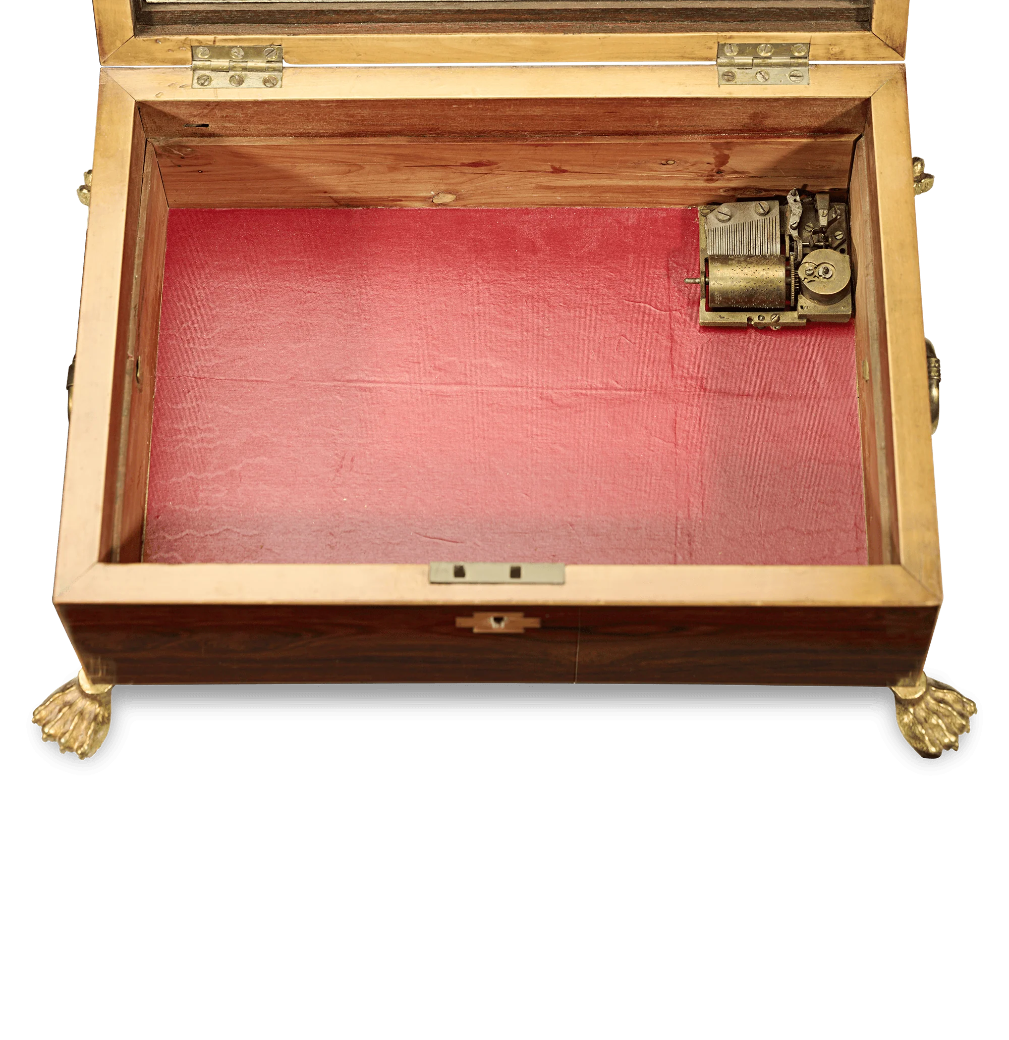 This charming musical jewelry and sewing box is a work of art inside and out. Crafted of rich wood, this chest is adorned with doré bronze details, including lion’s paw feet. Inside, the interior includes a mirror and spaces for rings and pin cushions atop hidden drawers for more precious valuables. All of these compartments are perfectly fitted within the box, while the musical mechanism emits an enchanting melody from within.