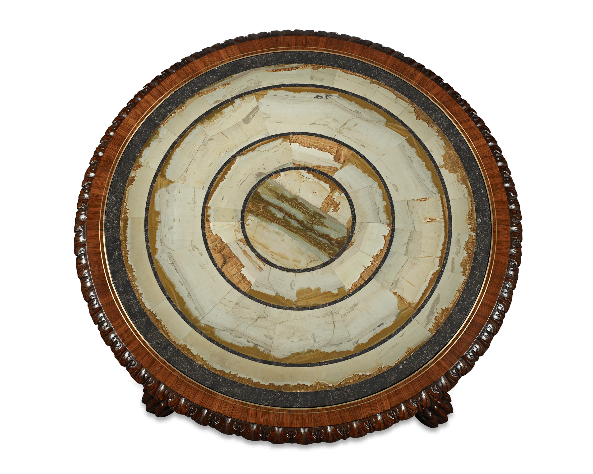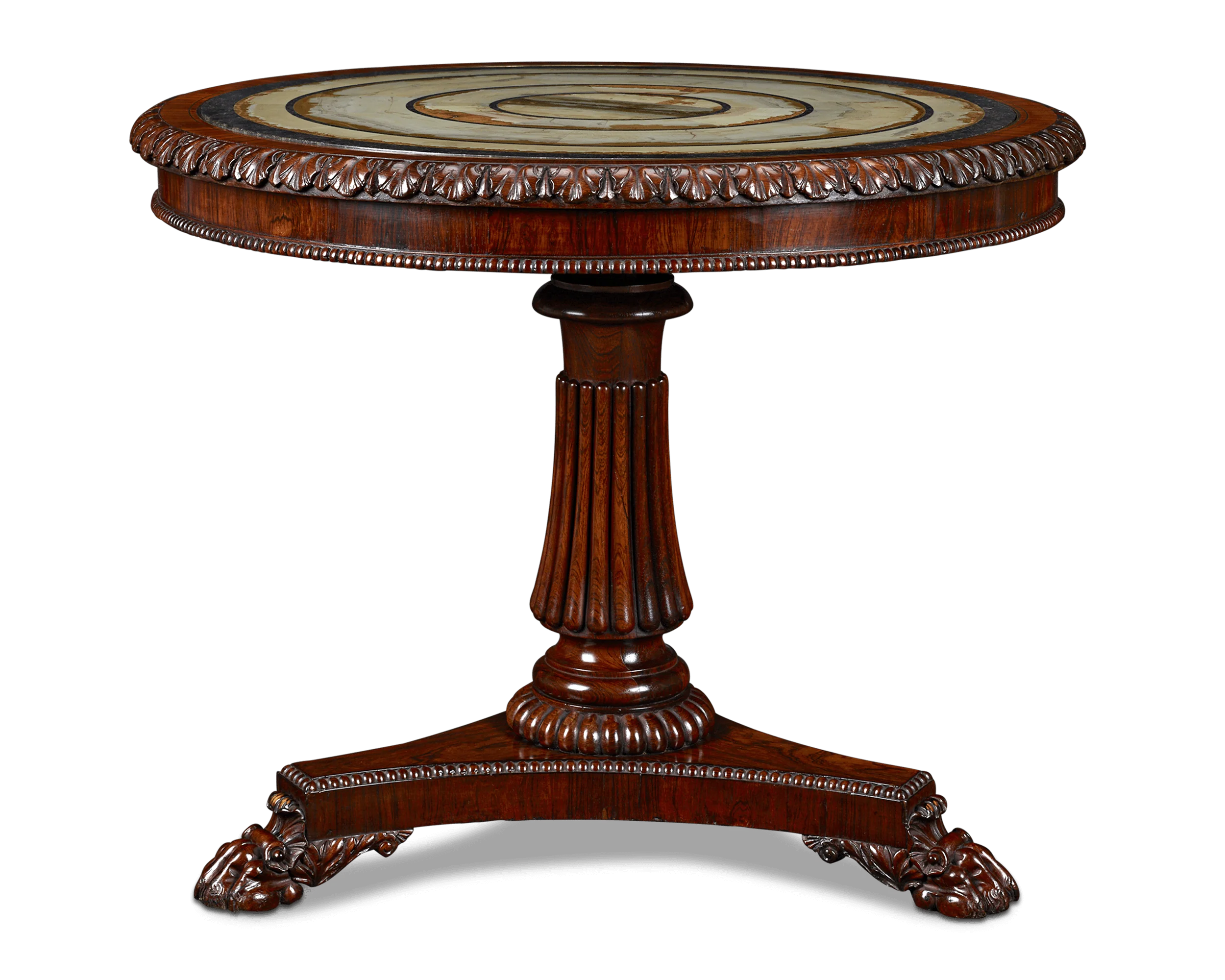 Pietra Paesina is one of the most scarce and wondrous stones on Earth, and the surface of this exceptional early 19th-century center table is inset with one of the rarest and most monumental examples of the natural wonder known to exist. The stone is set into a majestic rosewood base attributed to the renowned firm of Gillows of Lancaster and London, the favorite furniture makers of nobility and royalty throughout England. From the unique patterning of the precious Pietra Paesina to the magnificent carved central column and lion’s paw feet, this table evokes a sense of luxury and privilege.