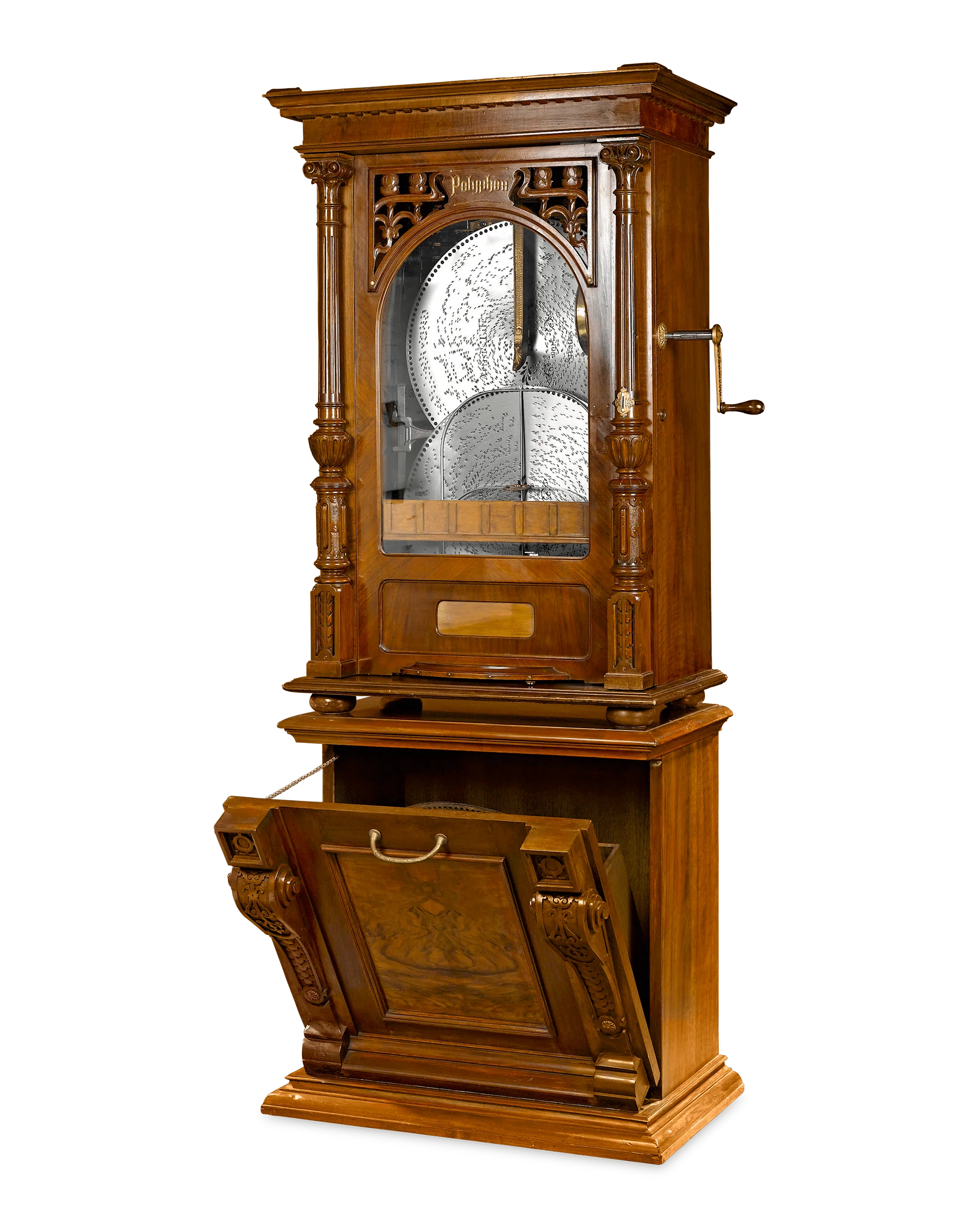 Standing over seven feet tall, this particular model features a magnificent walnut case with handsome burl panels on its original, matching storage cabinet. A true technical marvel for its day, Polyphon’s automatic disk changer symbolizes pure ingenuity and superlative craftsmanship. This antique player is accompanied by 12– 22-inch disks, with more available for purchase in any musical genre.
