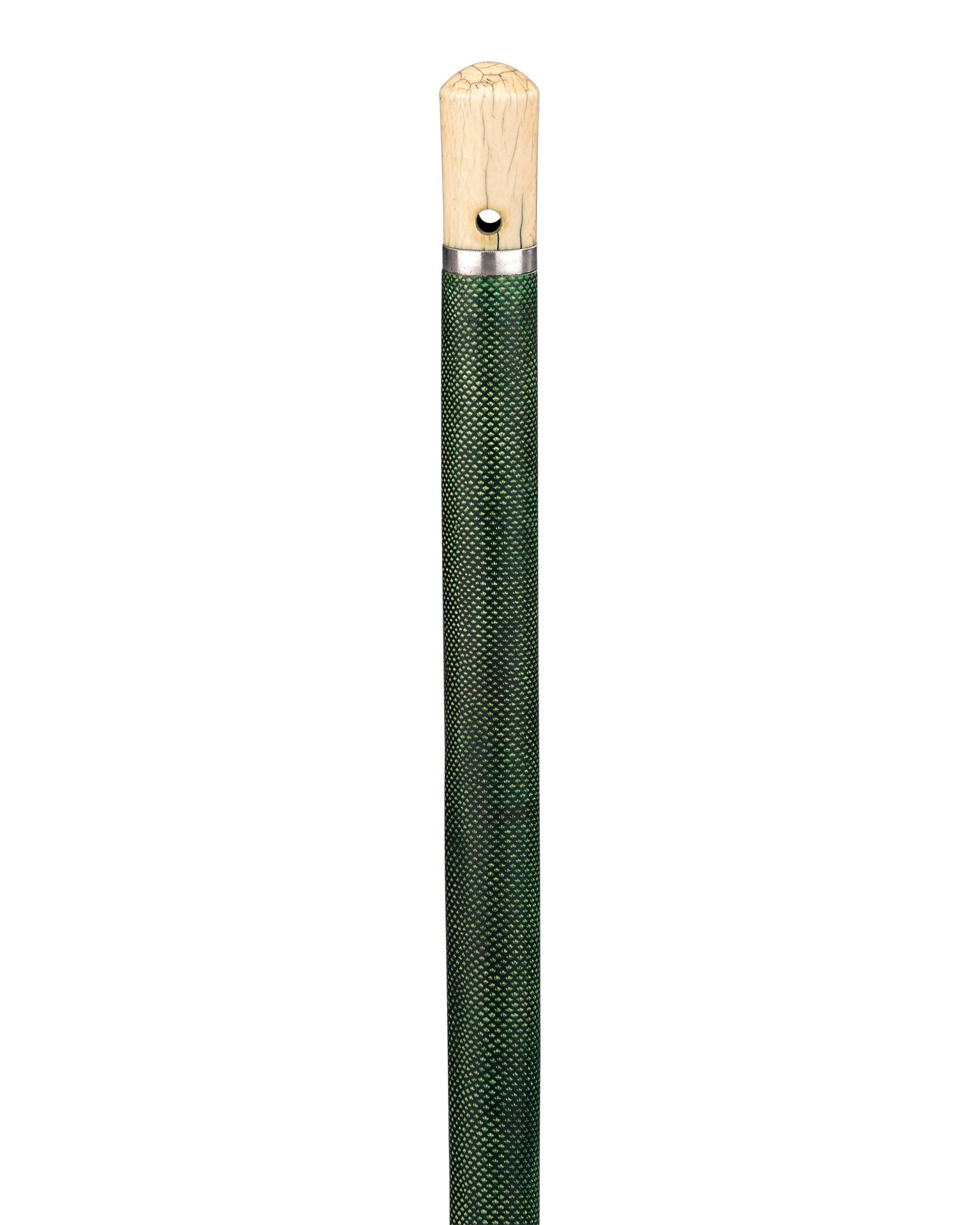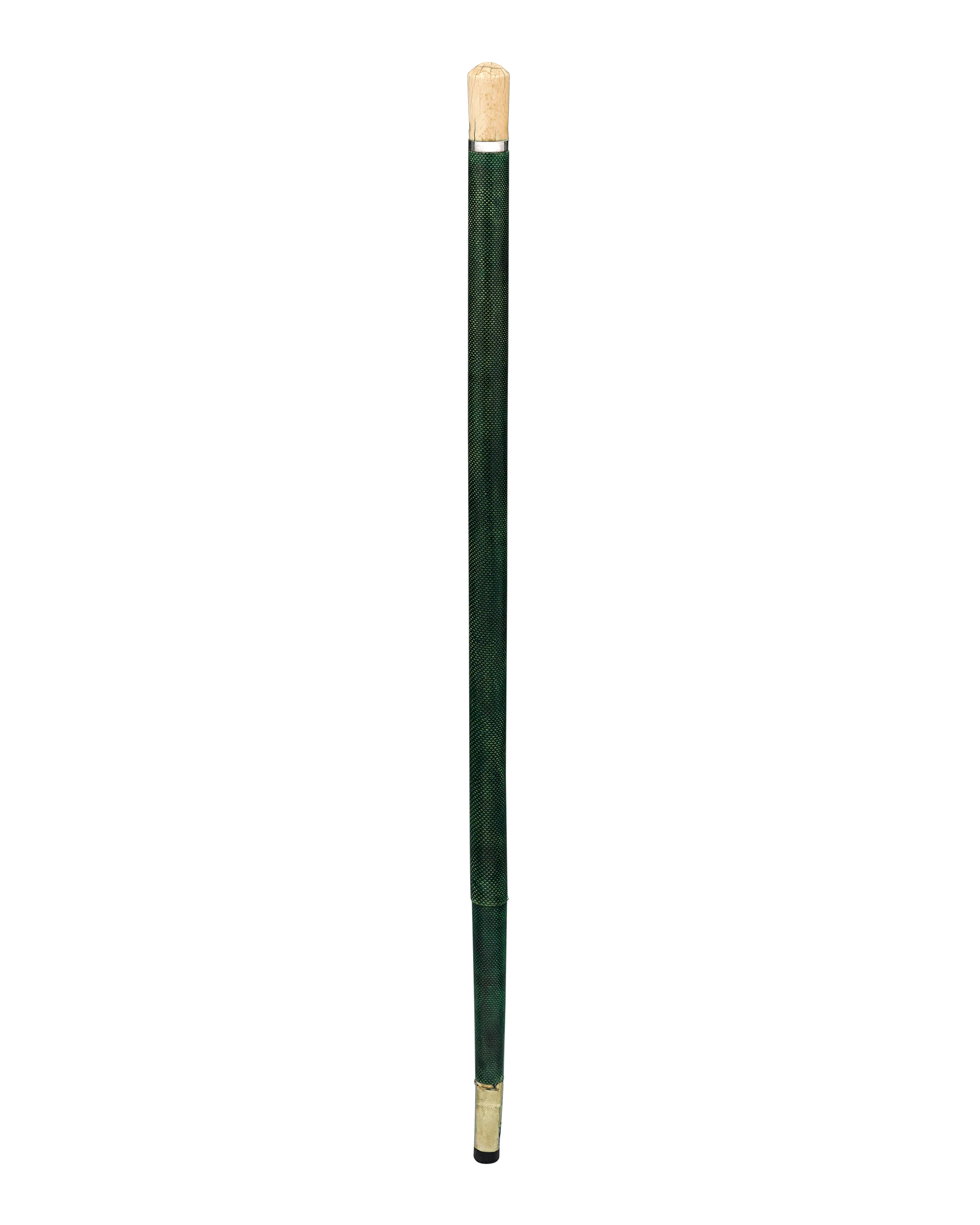 Covered entirely in luxurious emerald-hued shagreen, this cane houses a hand-held telescope within the shaft. Shagreen, or sharkskin leather, is a durable variety of hide used only for the most fashionable and valued objects of the 18th and 19th centuries. Covered by a characteristic network of tiny spines, the surface of the leather is ground and polished, producing smooth nodules that give the leather its luxurious appearance.