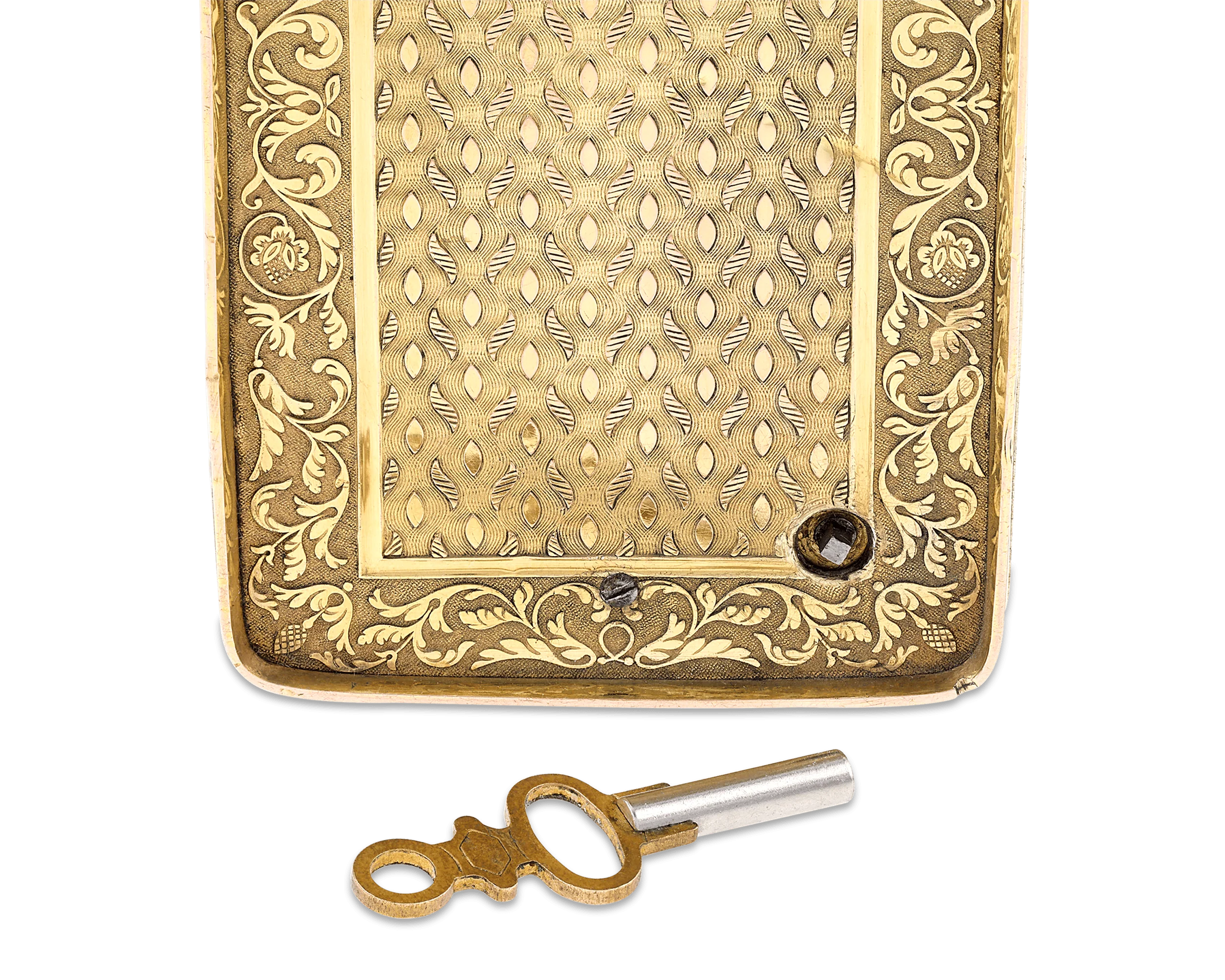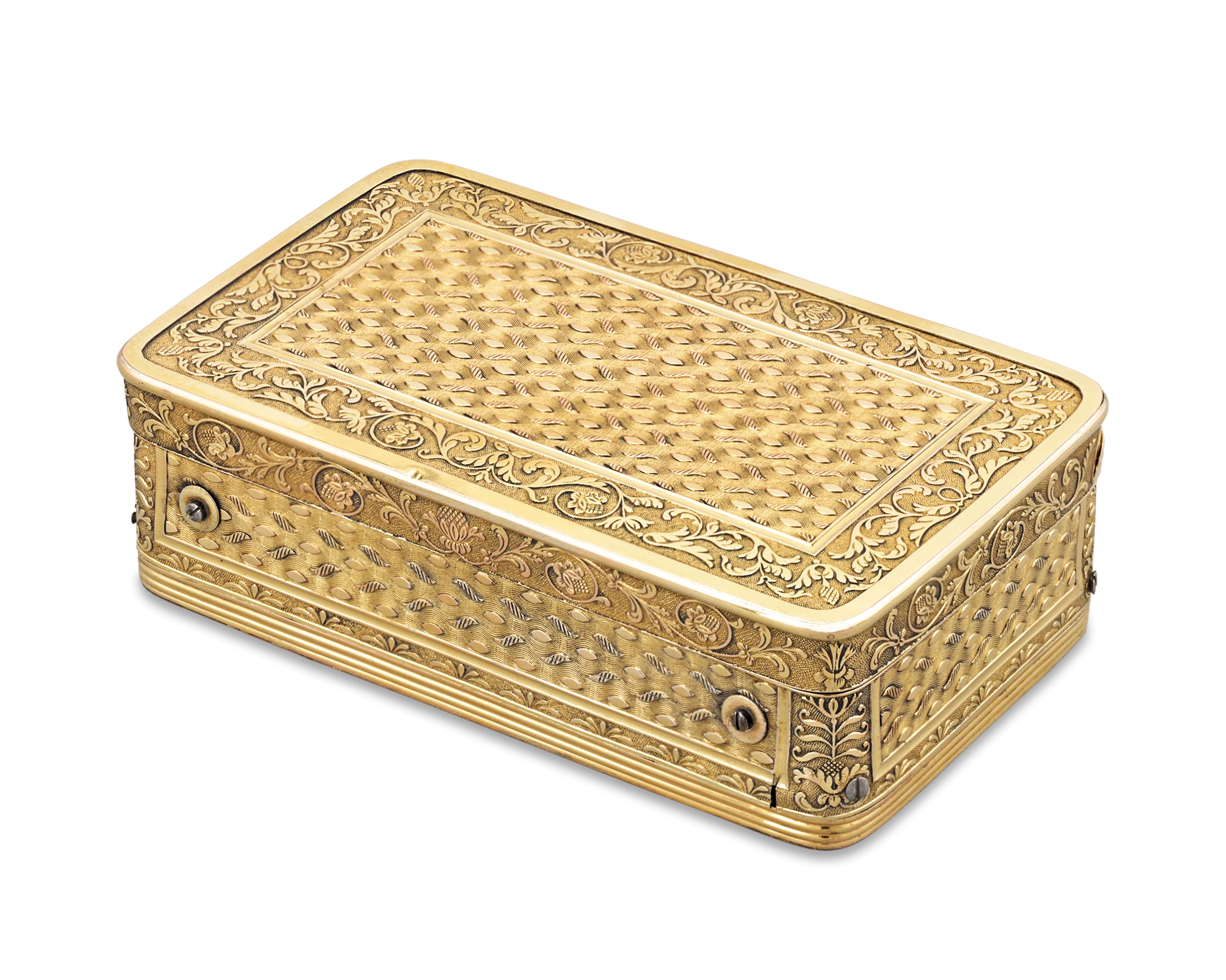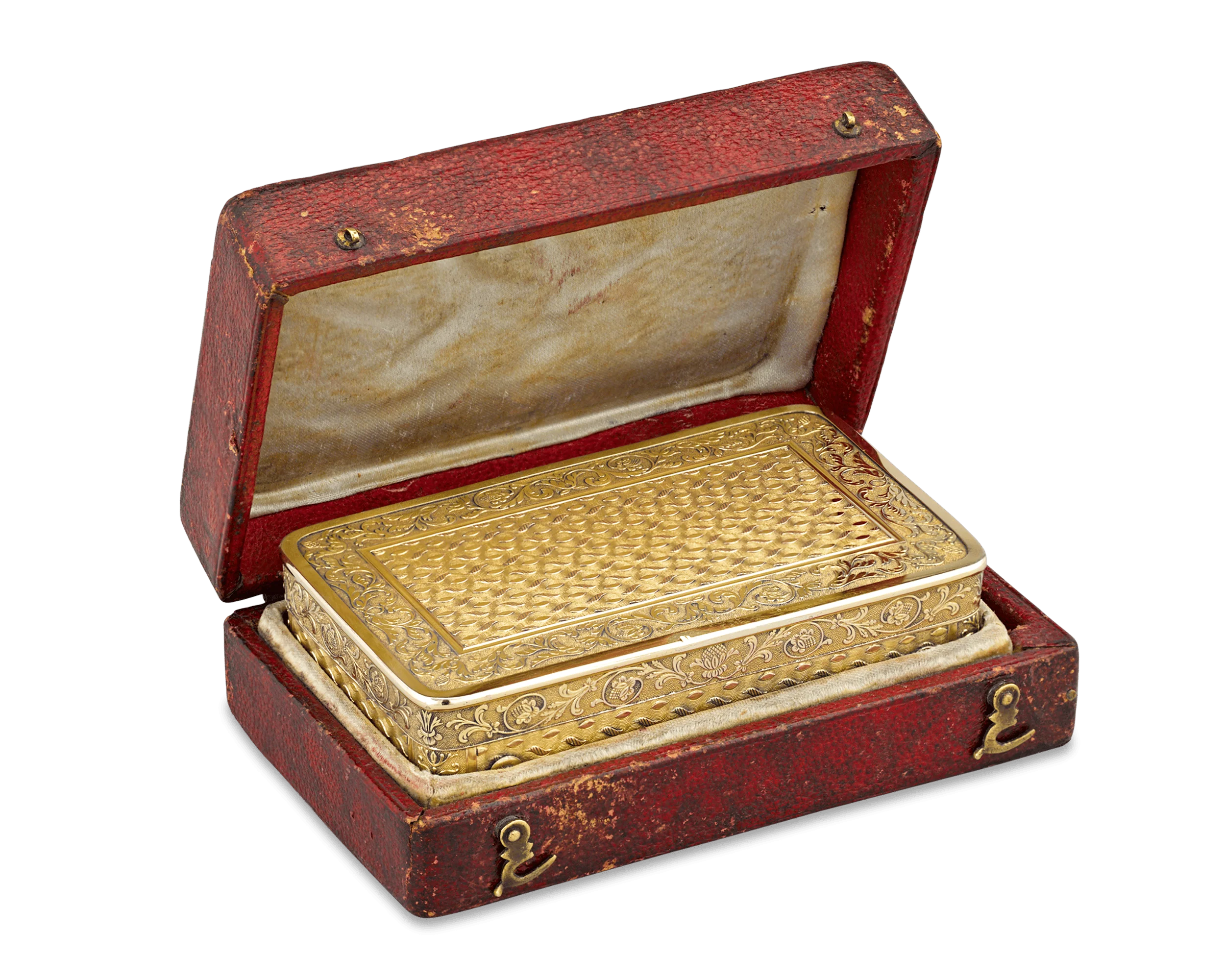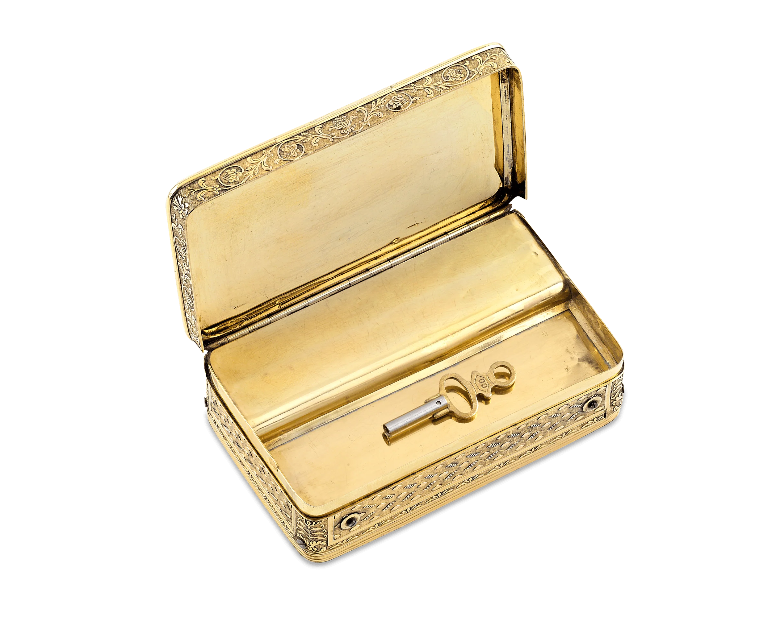This exceptional Swiss silver-gilt musical snuff box was crafted by the famed François Nicole. At first glance, the diminutive piece appears to simply be an exquisite 19th-century snuff box, with Neoclassical-style chased and engraved borders of foliage and flowering thistles. A quick wind of the key, however, reveals the complex mechanism hidden inside. The musical movement plays two airs with a fine single-piece comb of 61 teeth. The movement is in exceptional condition, complete with its original key.
