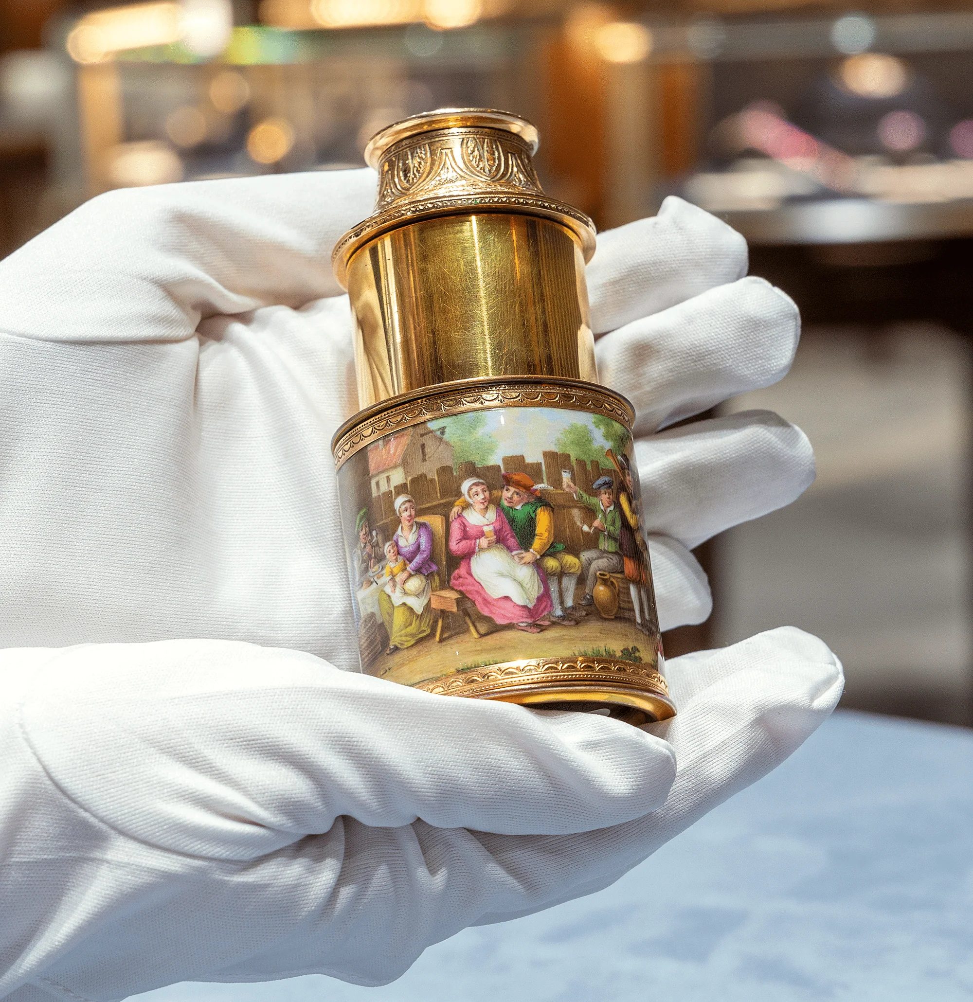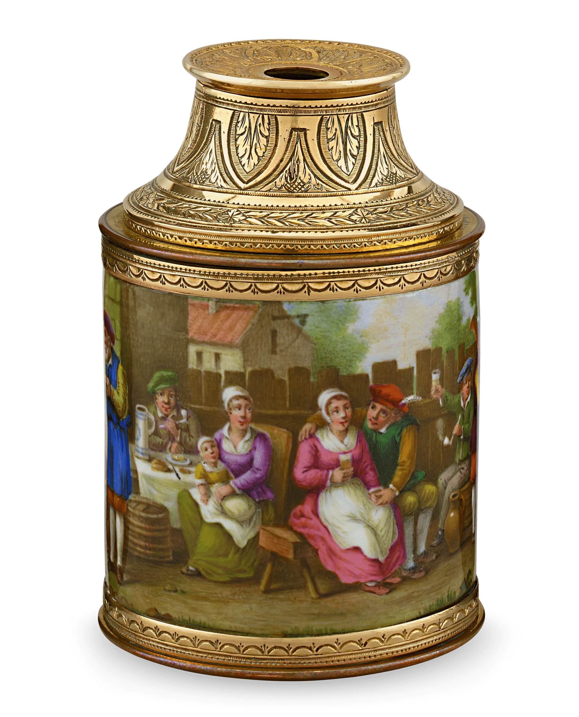 Scientifically advanced and exquisitely crafted, this rare 19th-century gold and enamel Swiss telescope is an item of exceptional luxury. The Swiss creation not only provides a magnified view with optimal clarity, but also showcases remarkable decoration in the form of elegant gold chasing and an enamel scene of tavern-goers holding hands and sharing a dance. Such a beautifully crafted item would have been created for the personal use of a wealthy and affluent individual.