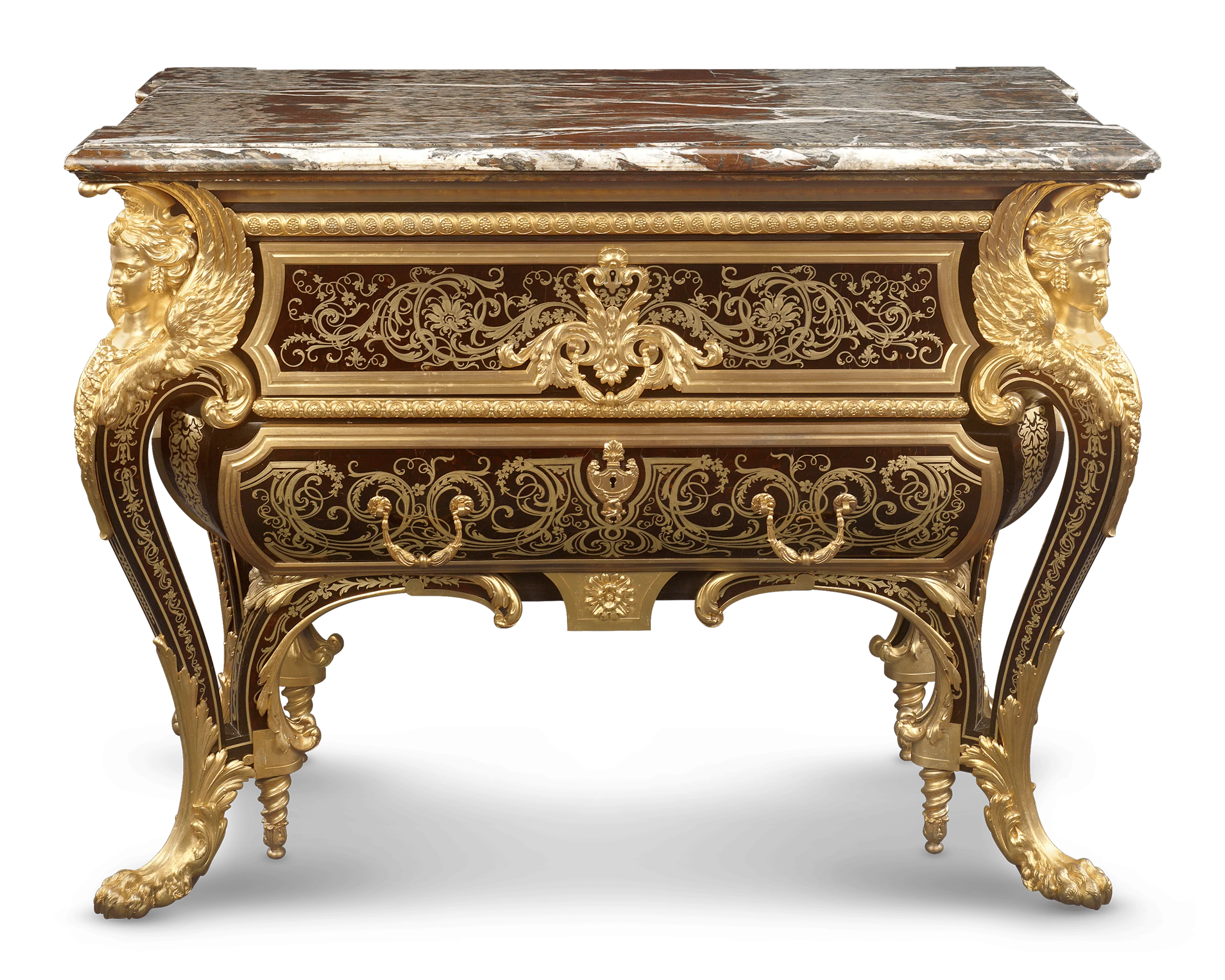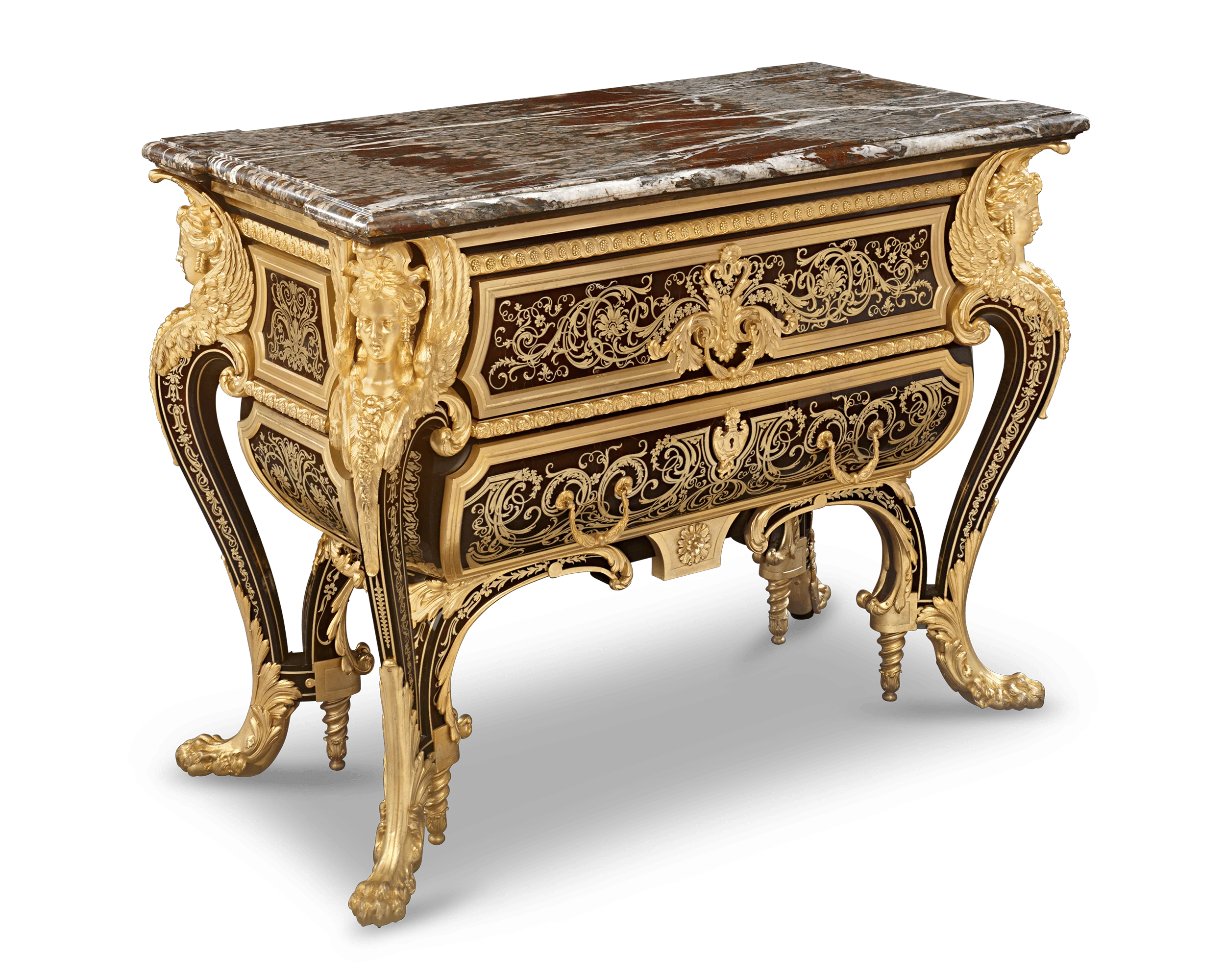 The original commodes made by Boulle inspired re-interpretations by history’s most esteemed craftsmen. First created and supplied in 1708 by Boulle for Louis XIV’s bed chamber at Versailles, the original pair was one of only four furnishings deemed worthy enough to be rescued from both destruction and sale after the French Revolution. They were placed in the Bibliothèque Mazarine at the Institut de France, where they became known as the Mazarine Commodes, but have since been returned to Versailles.