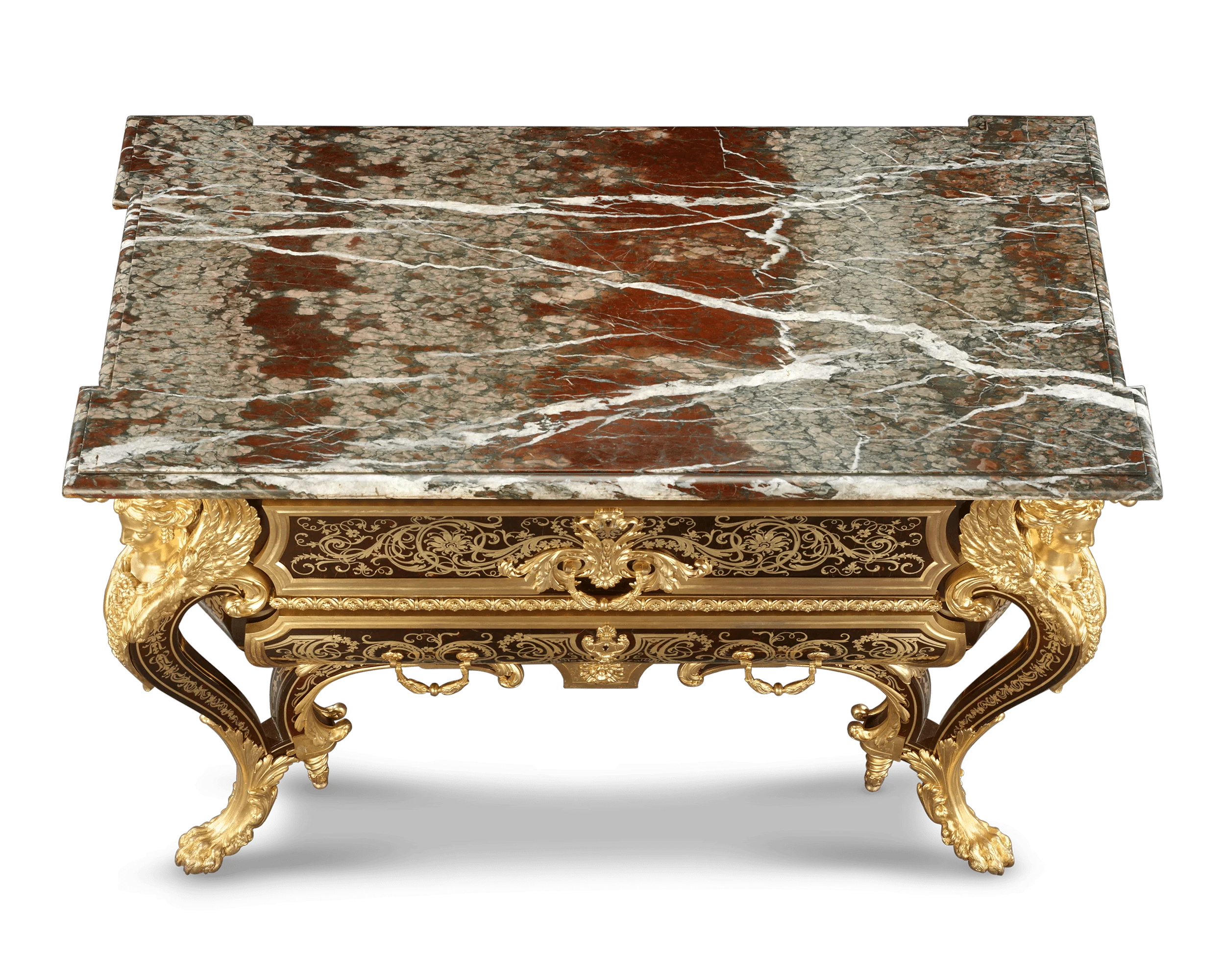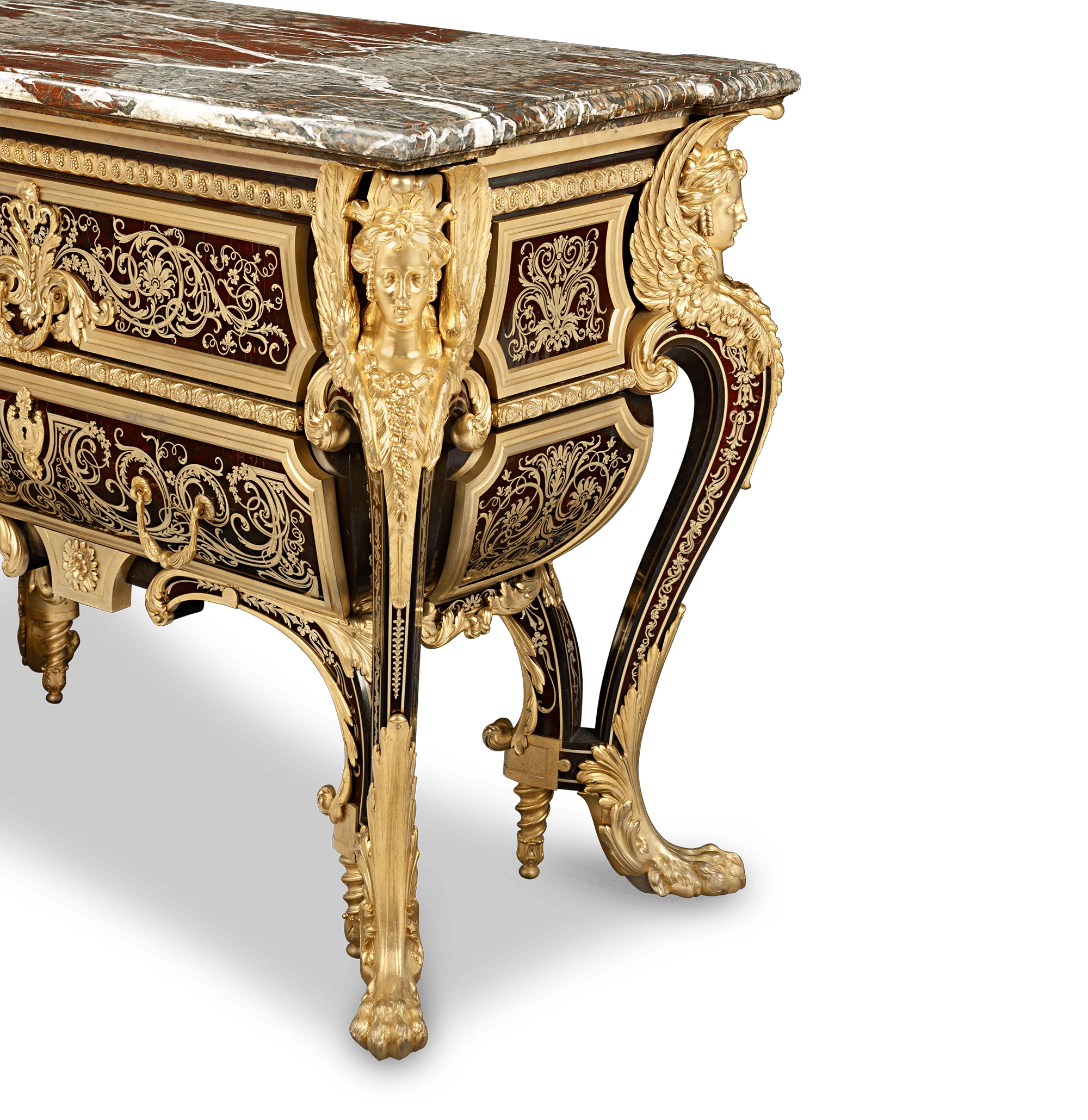 The commode’s top features a striking example of rare Campan marble, sourced from quarries in the French Pyrenees. This exceptional stone exhibits a refined blend of green, pink, red and white veining—distinguished by its subtler red tones compared to Italian varieties. Reflecting Boulle’s masterful innovation, the marble top is designed to be removable, resting securely within a slightly recessed edge on the wooden frame. This meticulous construction ensures stability without the use of glue, preserving the integrity of the piece.