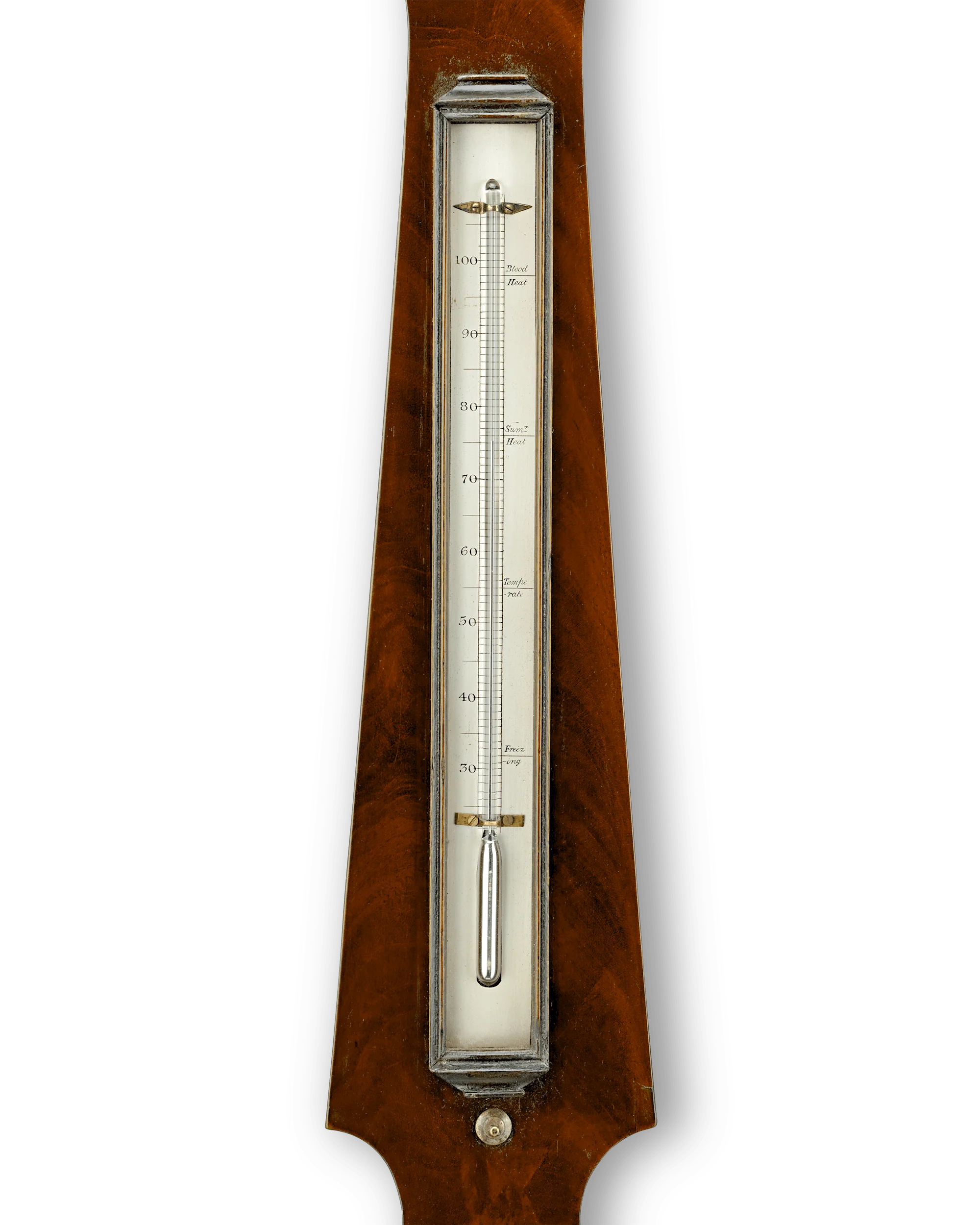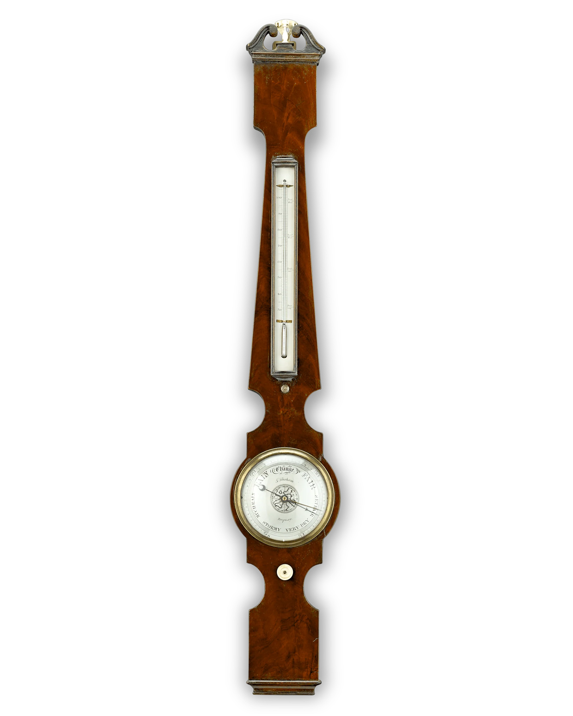 This wheel barometer, retailed by James Braham of Torquay, measures atmospheric pressure ranging from 28 to 31 inches of mercury. The mahogany casing also incorporates a mercury thermometer with designations for Blood Heat, Sum’r Heat, Tempe Rate and Freezing levels. Such meteorological instruments were once indispensable to gauging the coming weather. While many households had a barometer on their wall, only the most important and wealthy would have had an instrument of this caliber.