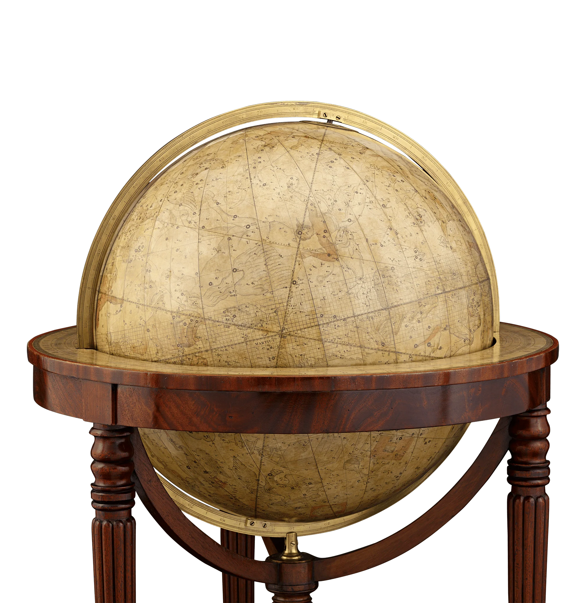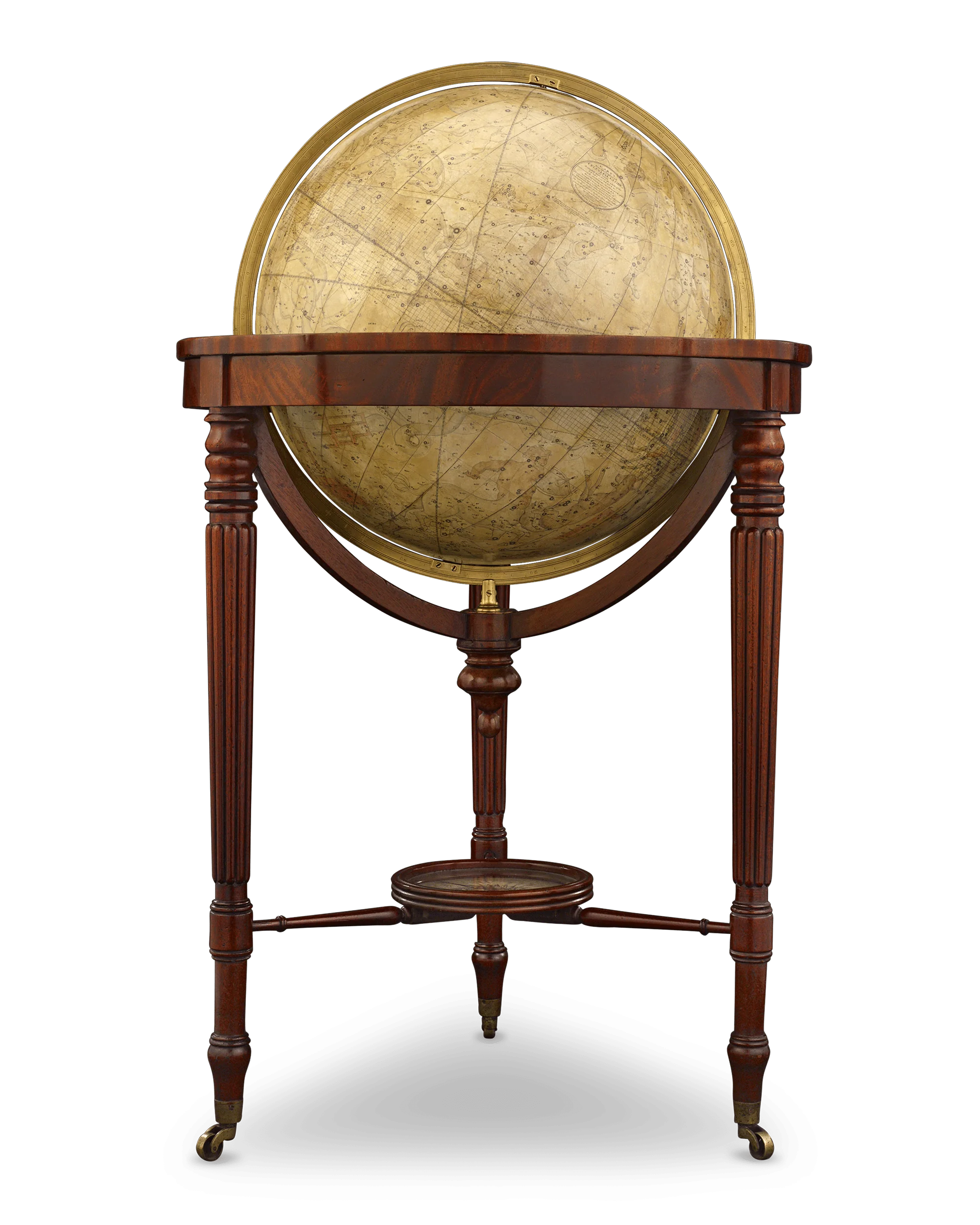 The terrestrial globe provided the most current geographical information of the time, including facts discovered during expeditions to the North Pole, while the celestial globe provided a timeless map of the heavens, an essential tool in shipping. The globes measure a robust 21 inches in diameter, making them exponentially larger than standard globes of this period and thus exceedingly rare. Each globe rests on classically beautiful mahogany triform stands, joined by functioning compass stretchers and accented with brass caps and castors. These globes display a magnificent patina and are encircled by engraved brass meridian rings and surmounted by hour rings.
